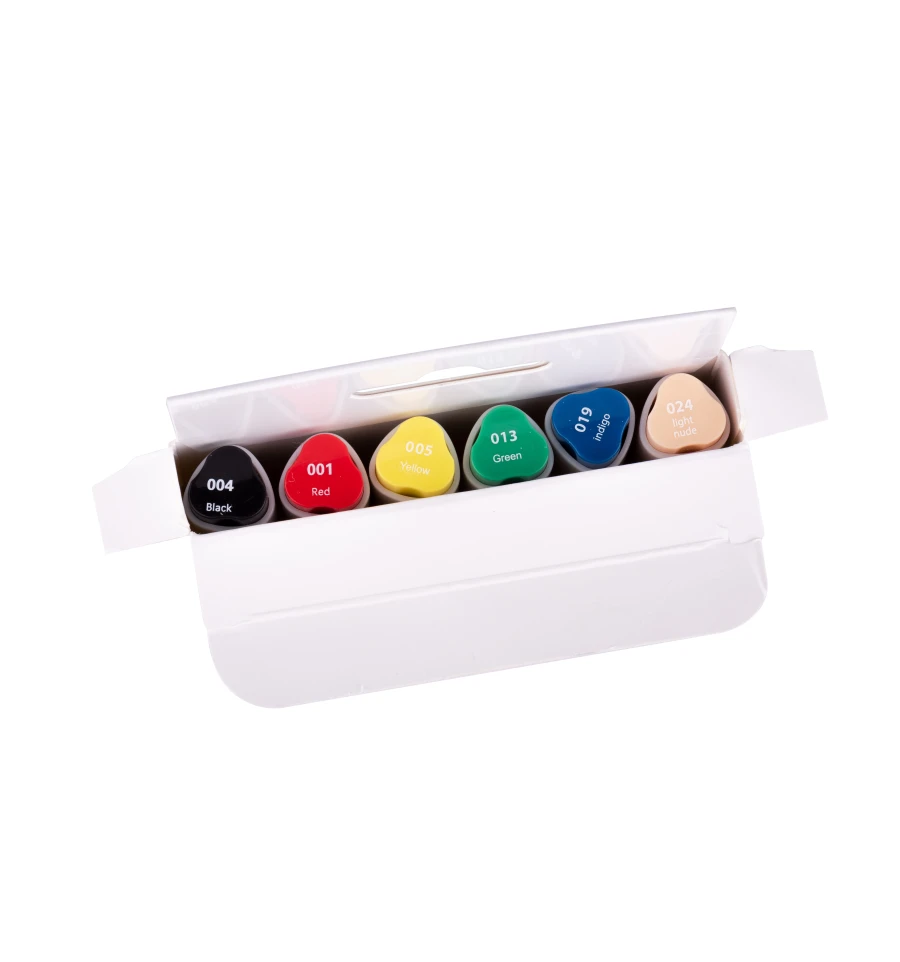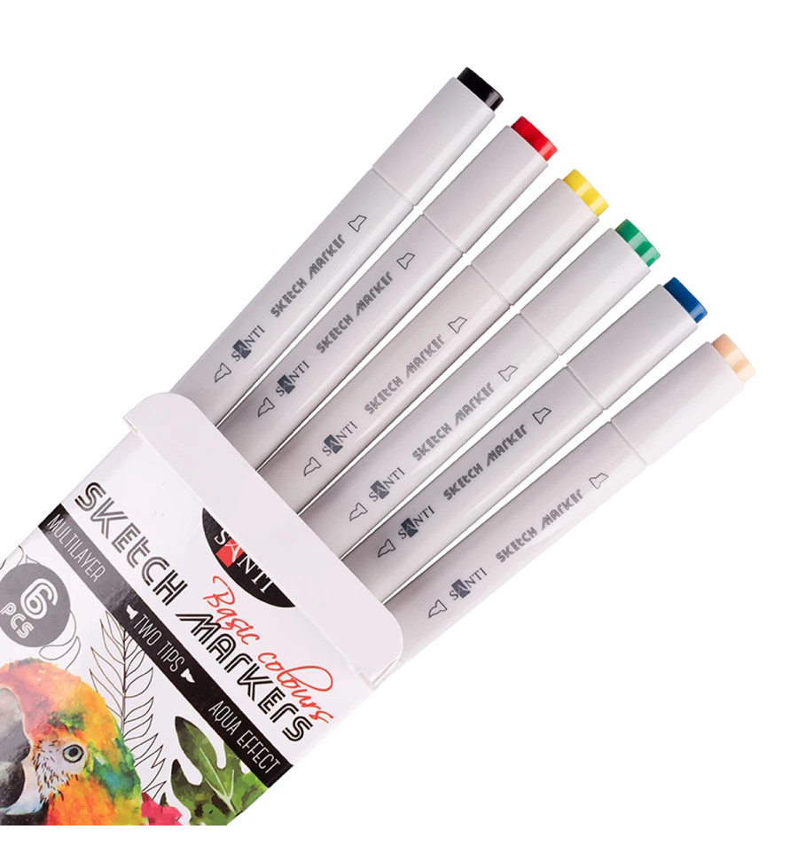 Скетч-маркери SANTI - це безмежні можливості для ваших малюнків! Тематичний набір "Basic Colours" складається з 6 базових і найпопулярніших відтінків. Водорозчинні, світлостійкі чорнила призначені для живопису і малювання в змішаних техніках. Поєднують в собі властивості маркерів і акварельних фарб. Для досягнення акварельного ефекту можна розмити деталі малюнка за допомогою змоченого водою пензля на папері або розбавити водою чорнило на палітрі. Оснащені двома видами наконечників: м‘який пензель для точної деталізації малюнка і долото - для заповнення великих фрагментів. Для роботи можна використовувати акварельний папір або спеціальний папір для малювання маркерами. Склад набору : 024 ясно-тілесний, 019 індиго, 013 зелений, 005 жовтий, 001 червоний, 004 чорний