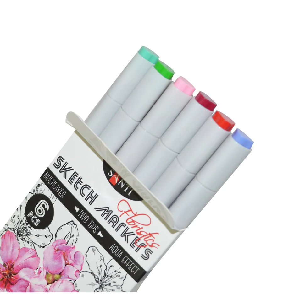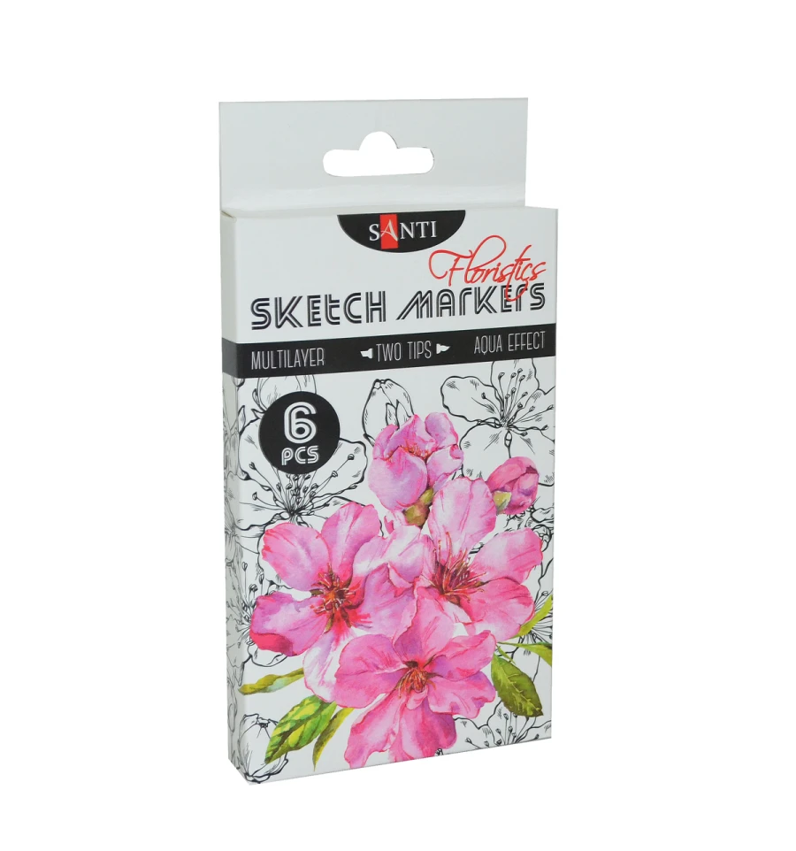 Скетч-маркери SANTI - це безмежні можливості для ваших малюнків! Тематичний набір "Floristics" складається з 6 відтінків для зображення рожевих флористичних мотивів і соковитої зелені. Водорозчинні, світлостійкі чорнила призначені для живопису і малювання в змішаних техніках. Поєднують в собі властивості маркерів і акварельних фарб. Для досягнення акварельного ефекту можна розмити деталі малюнка за допомогою змоченого водою пензля на папері або розбавити водою чорнило на палітрі. Оснащені двома видами наконечників: м‘який пензель для точної деталізації малюнка і долото - для заповнення великих фрагментів. Для роботи можна використовувати акварельний папір або спеціальний папір для малювання маркерами. Склад набору: 014 пурпурно-червоний, 026 яскраво-червоний, 028 ясно-рожевий, 029 бузковий, 030 малахіт, 011 світло-зелений.