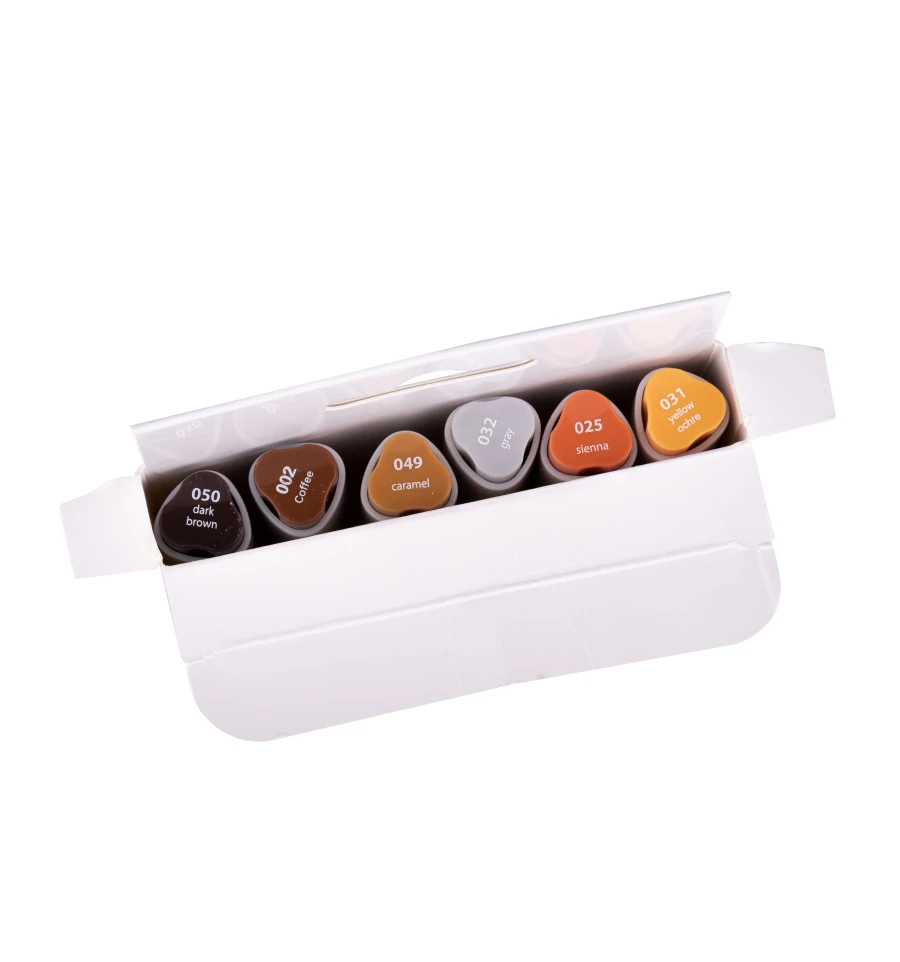 Водорозчинні, світлостійкі чорнила призначені для живопису і малювання в змішаних техніках. Поєднують в собі властивості маркерів і акварельних фарб. Для досягнення акварельного ефекту можна розмити деталі малюнка за допомогою змоченого водою пензля на папері або розбавити водою чорнило на палітрі. Оснащені двома видами наконечників: м‘який пензель для точної деталізації малюнка і долото - для заповнення великих фрагментів. Для роботи можна використовувати акварельний папір або спеціальний папір для малювання маркерами. Склад набору: 031 охра жовта, 025 Сієна, 032 сірий, 049 карамель, 002 кавовий, 050 темно-коричневий