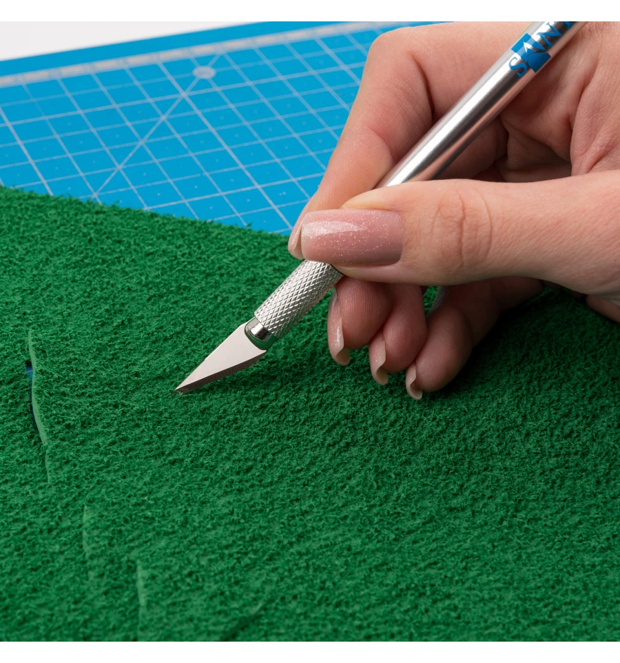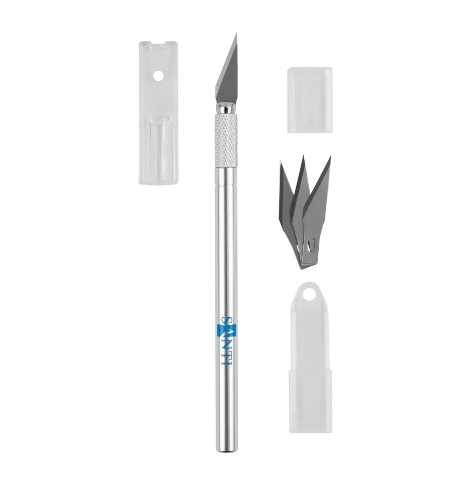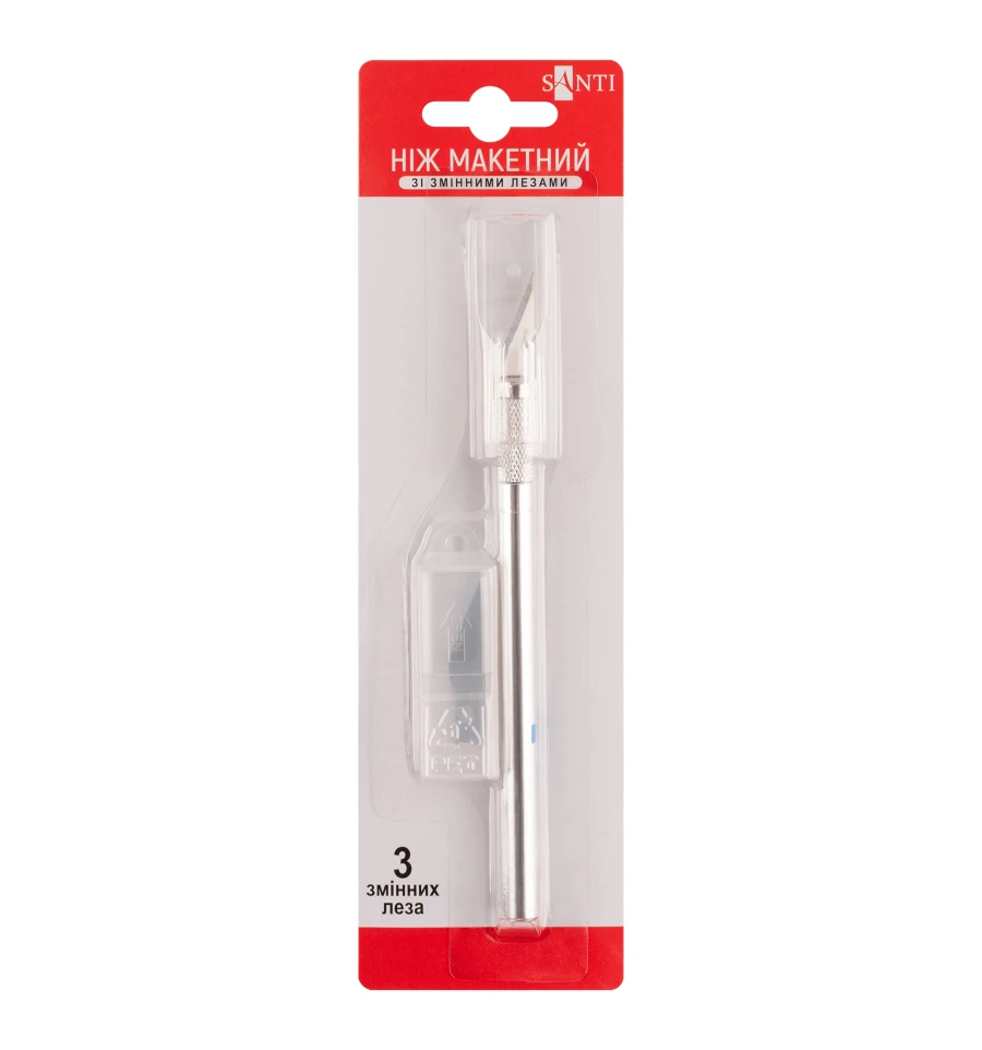 Професійний макетний ніж для фігурного різання. Сталевий зі змінними лезами і цанговим затискачем, універсальний інструмент для різних видів дизайнерських робіт. Використовується в таких технiках як скрапбукінг, декупаж, кірігамі. Дуже зручний для вирізання складних елементів і швидкої зміни лез. Застосовується для фігурного різання рiзних матеріалів, таких як фетр, папір, картон, пластик, шкіра, декупажний папір, веллум, рисовий папір та інших матеріалів. Використання ножів на макетних килимках дозволяє лезу ножа залишатися гострим набагато довше. Лезо змінне і витримує до 15 000 циклів порізки.