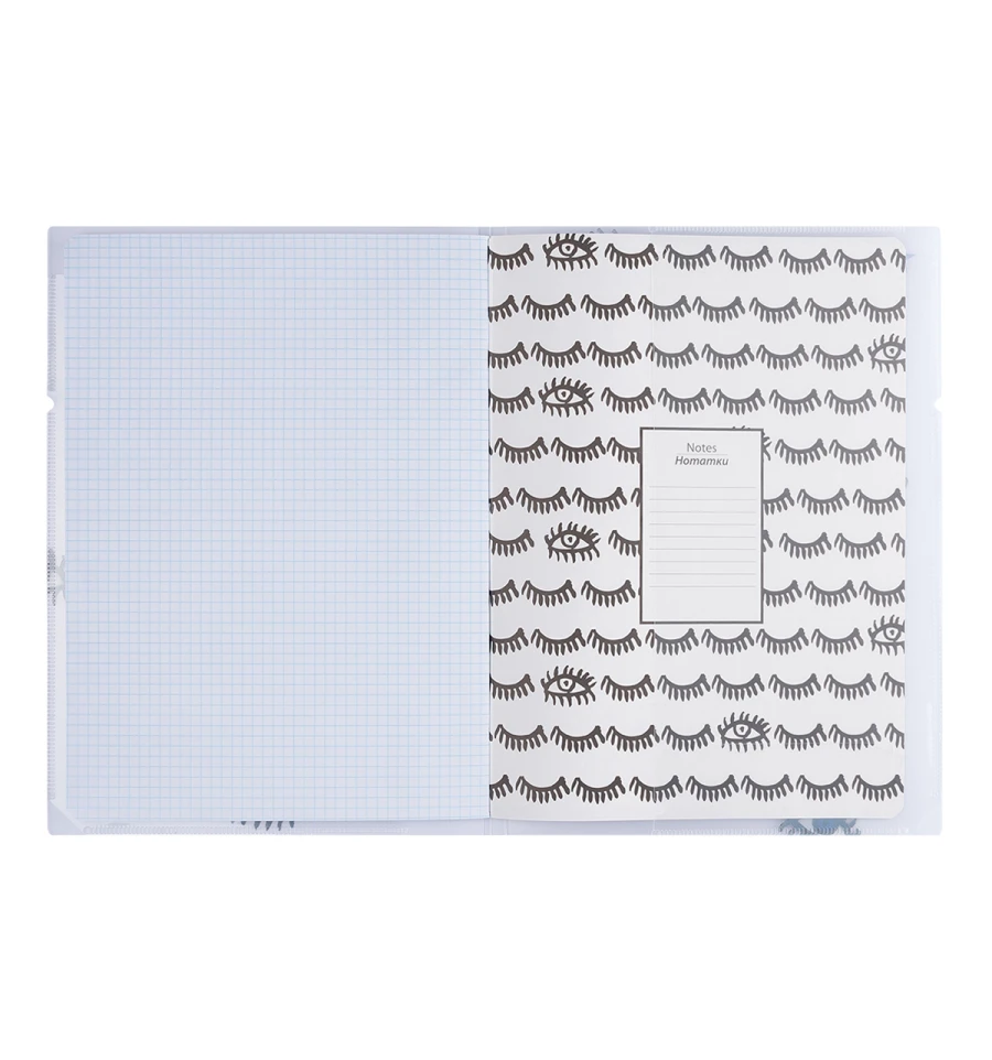 Зошит А4 формату в прозорій пластиковій папці від торгівельної марки YES має знімний внутрішній блок в клітинку з кріпленням на скобах та гнучку обкладинку-папку з резинкою для фіксації, яка захищає зошит від забруднення та деформації.