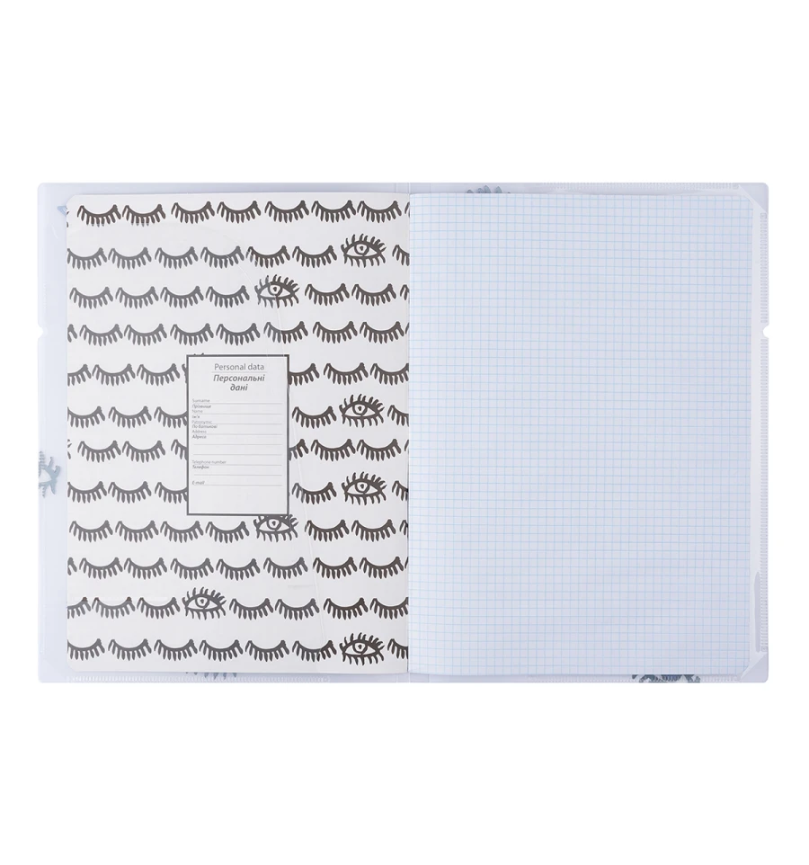 Зошит А4 формату в прозорій пластиковій папці від торгівельної марки YES має знімний внутрішній блок в клітинку з кріпленням на скобах та гнучку обкладинку-папку з резинкою для фіксації, яка захищає зошит від забруднення та деформації.