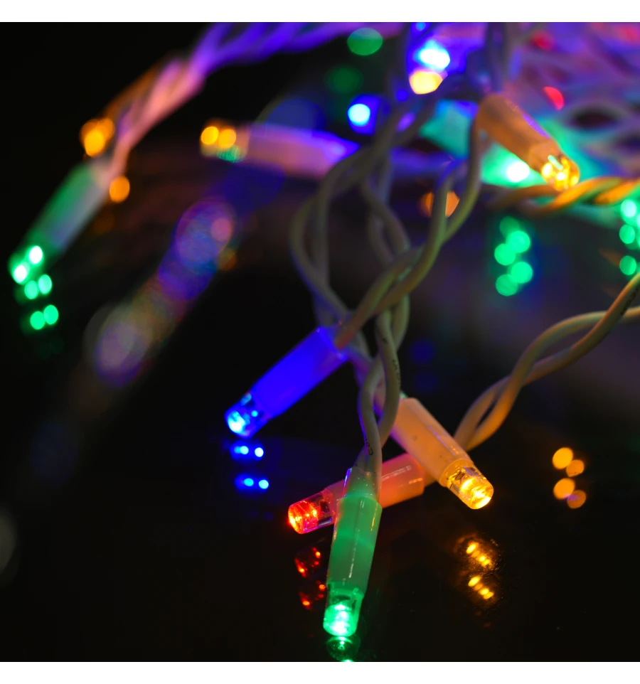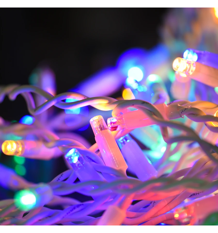 Електрогірлянда бахрома вулична використовується для вуличного декорування. Колір лампочок, що світяться - різнокольорова; колір дроту - білий. Кількість лампочок: 80 шт. Ступінь захисту електрогірлянди IP 65. Довжина проводу: 5,5 м. Склад: каучук, електричний провід. Джерело живлення: від мережі (220-240 В, 50-60 Гц, 6 Вт).