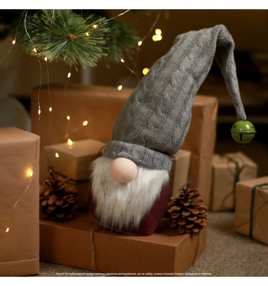 Гном із дзвіночком чудово впишеться у будь-який святковий декор: його можна розмістити біля ялинки, біля каміна, на поличці, у передпокої або використовувати як частину різдвяної композиції. Він стане яскравим акцентом інтер‘єру та обов‘язково викличе усмішку у дітей та дорослих.
