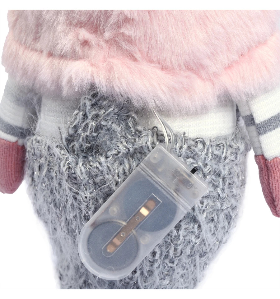 Особливістю цього гнома є LED-носик, який м‘яко світиться теплим сяйвом. Тепле світло створює атмосферу спокою, казки та затишку – ідеальне доповнення до чарівних різдвяних вечорів. Підсвічування працює від двох батарей CR2032 (демонстраційні батареї вже встановлені), а акуратний вимикач розташований на спинці гнома, залишаючись непомітним.