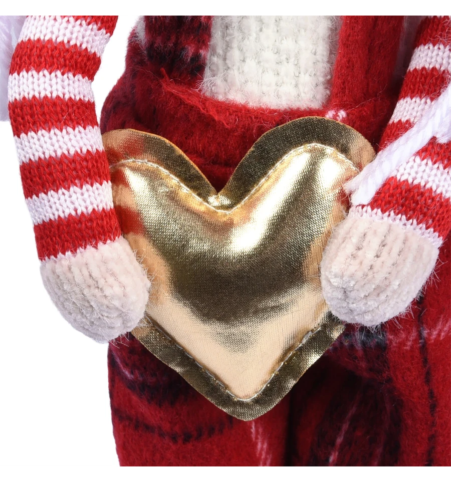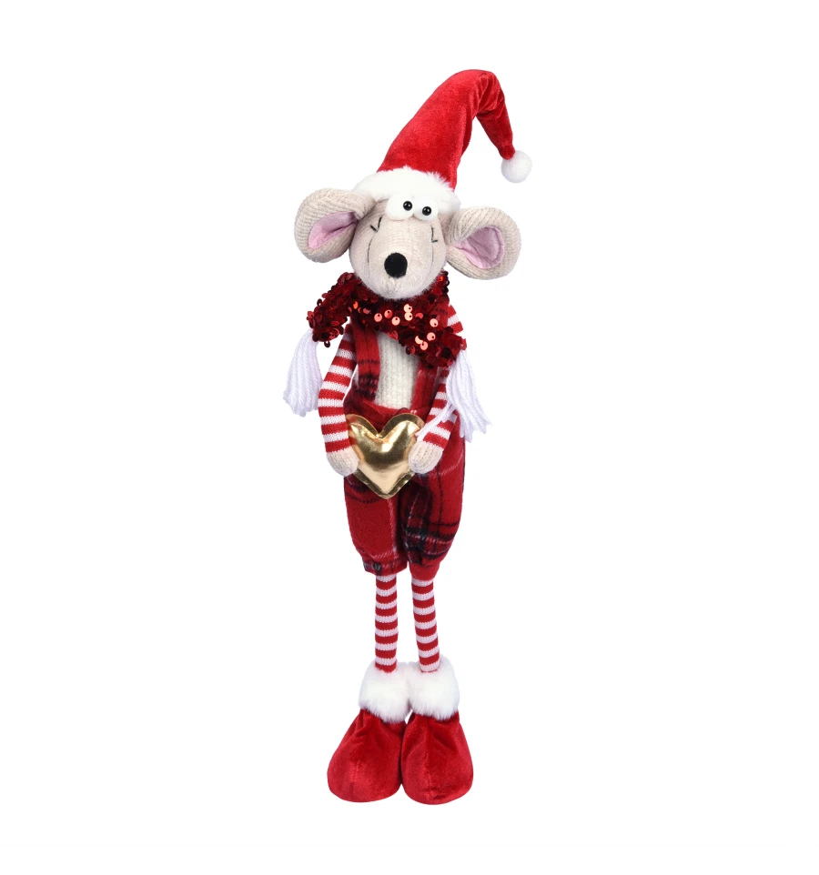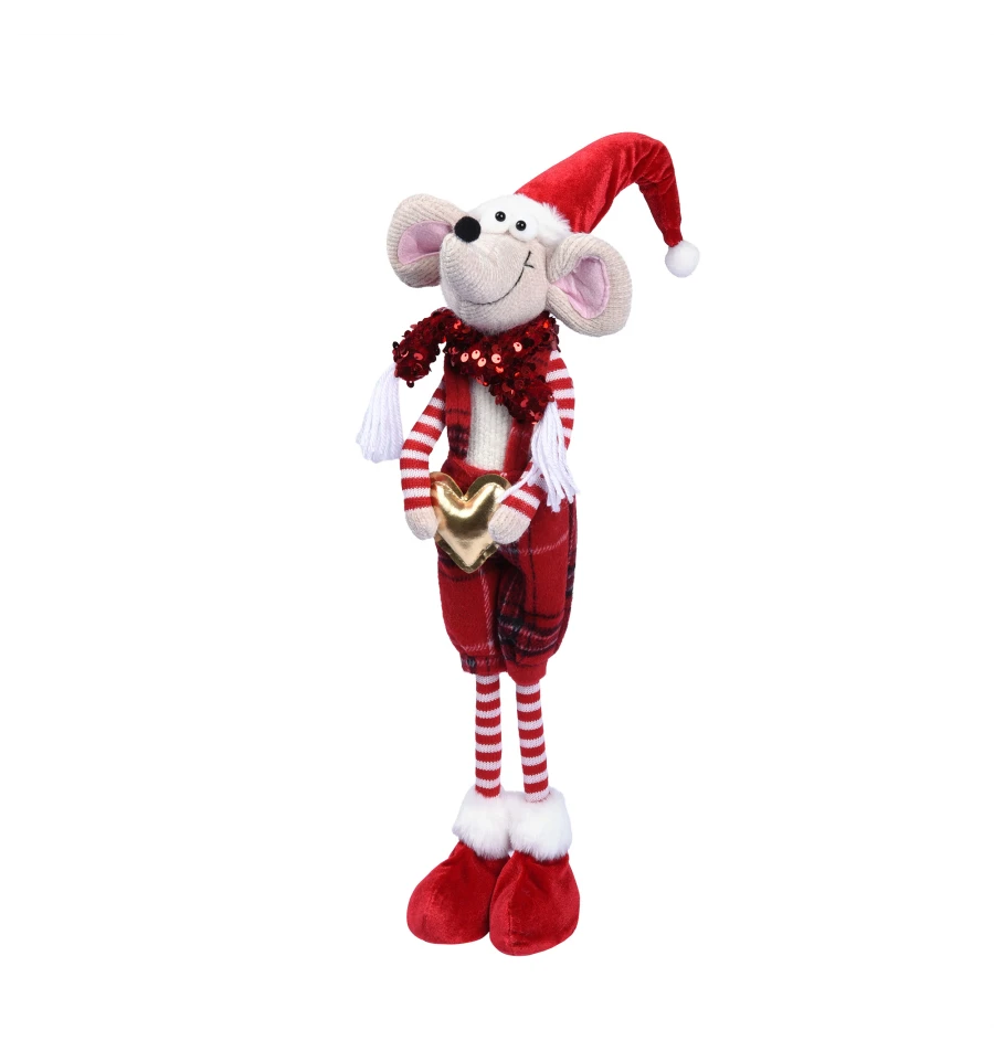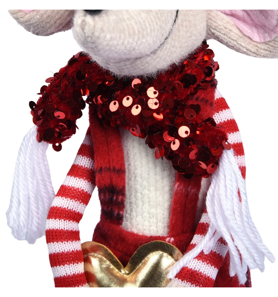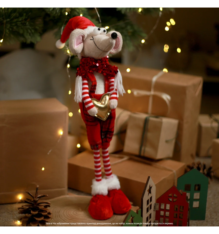 Новорічне Мишеня - це чарівний і милий персонаж у яскравому червоному вбранні, веселих смугастих панчохах і шапочці з помпоном, який моментально створить атмосферу радості та свята у вашому будинку. У долоньках він тримає золоте серце - символ тепла, любові та добрих побажань. Пухнасті вушка, кумедна мордочка і м‘які тапочки у червоно-білій гамі створюють неповторний новорічний образ, який сподобається і дітям, і дорослим.