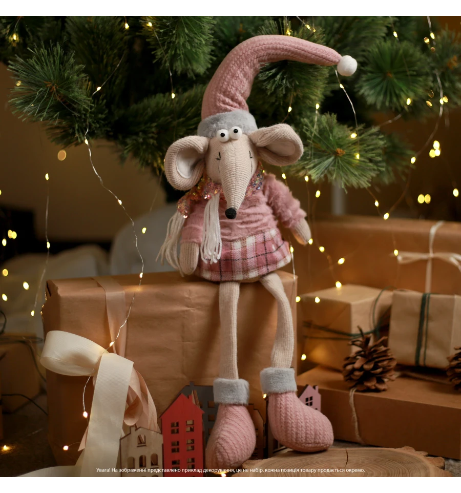 Дівчинка мишеня в рожевому вбранні ТМ Novogod‘ko чудово підійде для прикраси вітальні, дитячої кімнати, каміна, простору під ялинкою або святкової композиції. Розмір 69 см перетворює іграшку на ефектний елемент декору, який точно не залишиться непоміченим.