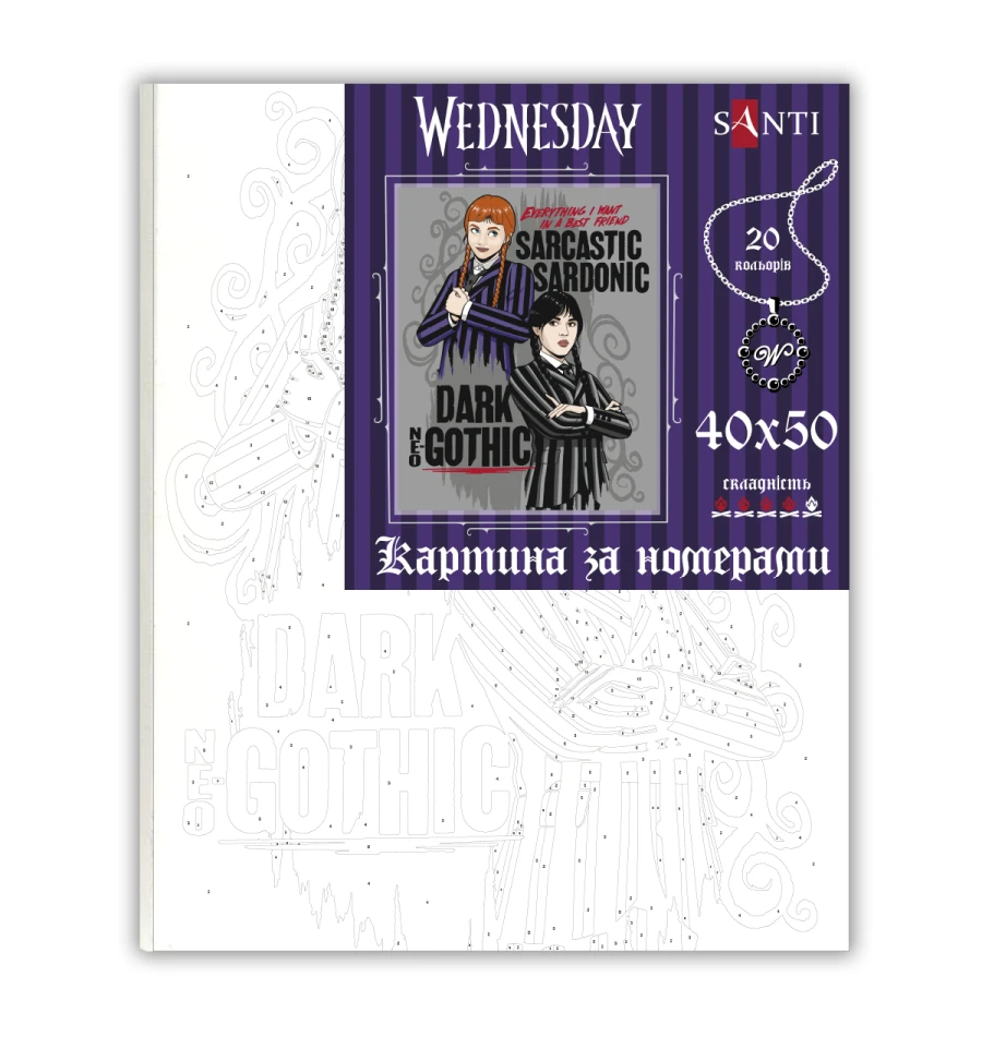 У кожній картині за номерами ТМ SANTI представлені цікаві та знайомі персонажі серіалу Венздей, які перетворюють малювання на цю пригоду. Дитина не тільки отримає задоволення від творчого процесу, а й зможе з гордістю прикрасити свою кімнату власним шедевром із улюбленими персонажами!