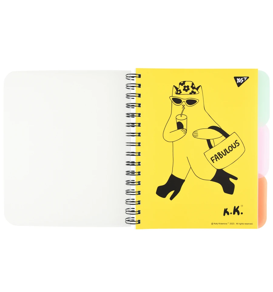 Зошит А5, 144 аркуша, розділений пластиковими закладками на 4 блоки по 36 аркушів. Яскравість друку внутрішнього блоку не подразнює очі при тривалому навчанні або роботі. Кількість аркушів - оптимальна для виконання записів. Пластикова обкладинка виконана в декількох варіантах дизайну. Виробник: ТМ "YES". Рекомендований для використання в освітніх установах, а також підійде офісним співробітникам.