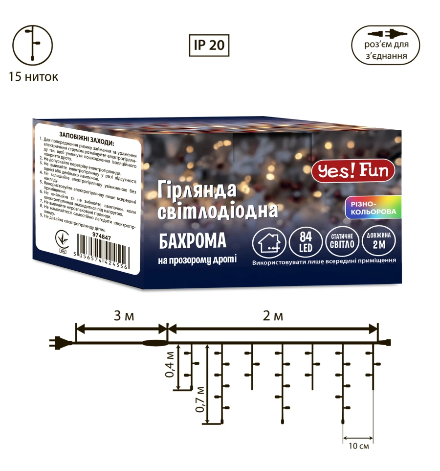 Електрична гірлянда-штора Yes! Fun Бахрома - чудовий варіант прикраси приміщення. Закріпіть її на карнизі вікна або з внутрішньої сторони балкона і увімкніть - безліч мініатюрних лампочок м‘яко засяють, створюючи дивовижну обстановку.