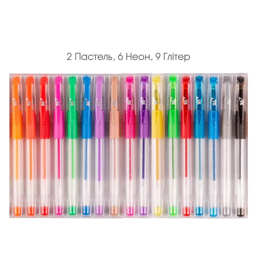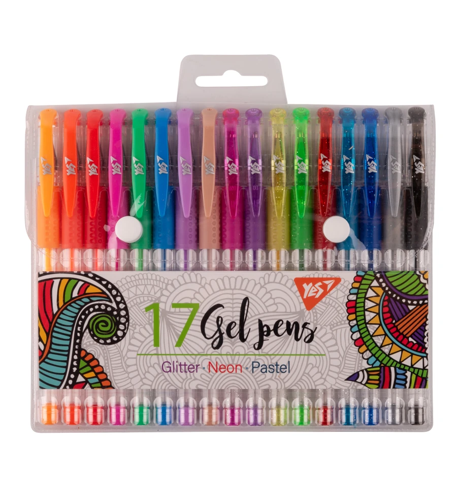 У наборі 17 ручок – 17 яскравих кольорів чорнила. Насолоджуйтесь яскравими кольорами із гелевими ручками. Вони призначені як для дітей, так і для дорослих. Підходять для створення різних малюнків, розмальовок, оформлення конспектів, журналів та щоденників. Ручки мають ергономічний прогумовий грип, що зменшить втому від довгого письма. Чорнила лягають чіткою та рівномірною лінією, зберігають яскравість на білому та кольоровому папері, не вигоряють згодом. До складу набору входять ручки з наступними ефектами: пастель-2 шт., неон-6шт., гліттер-9 шт. Товщина лінії письма: 0.8мм, 1.00 мм. Тривалий термін служби, легке письмо та завжди відмінна якість – безперечні переваги ручок YES! Творіть із ручками YES!