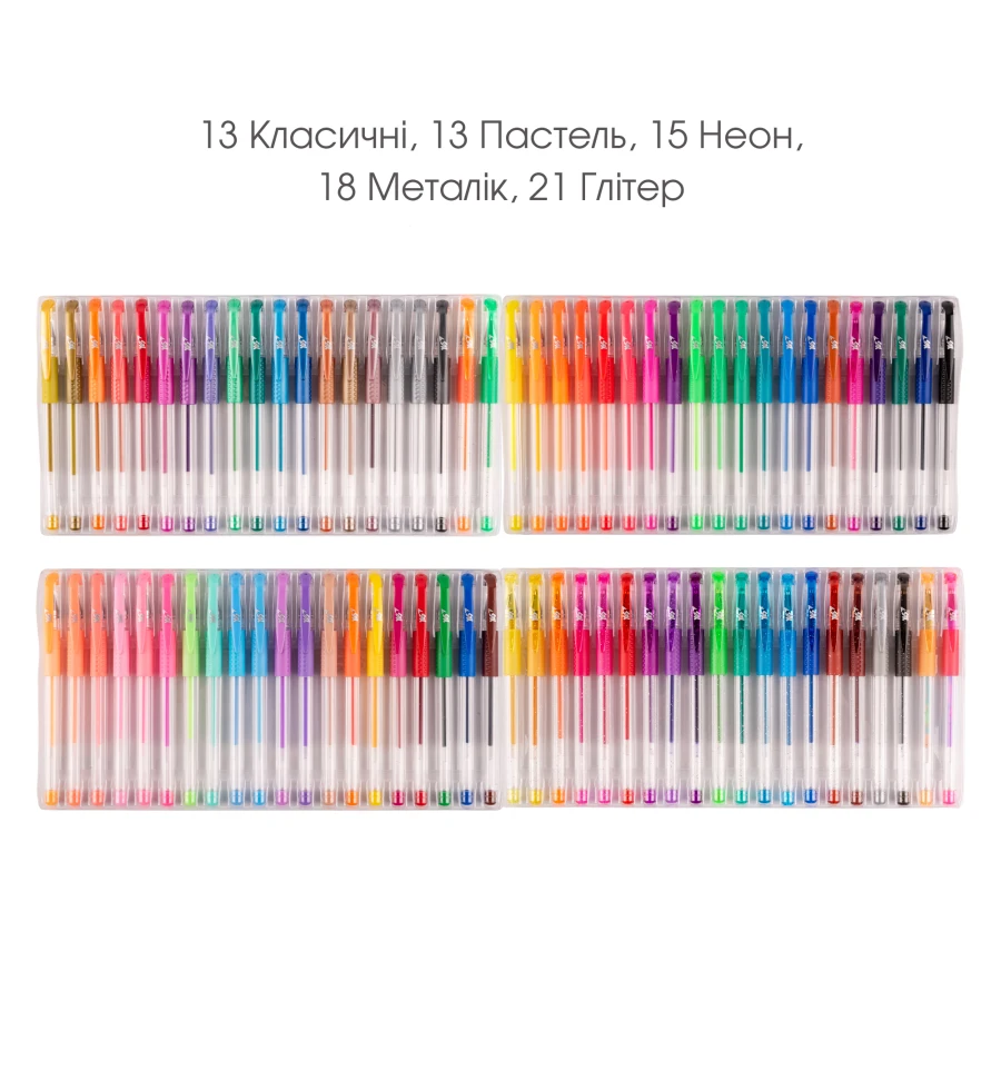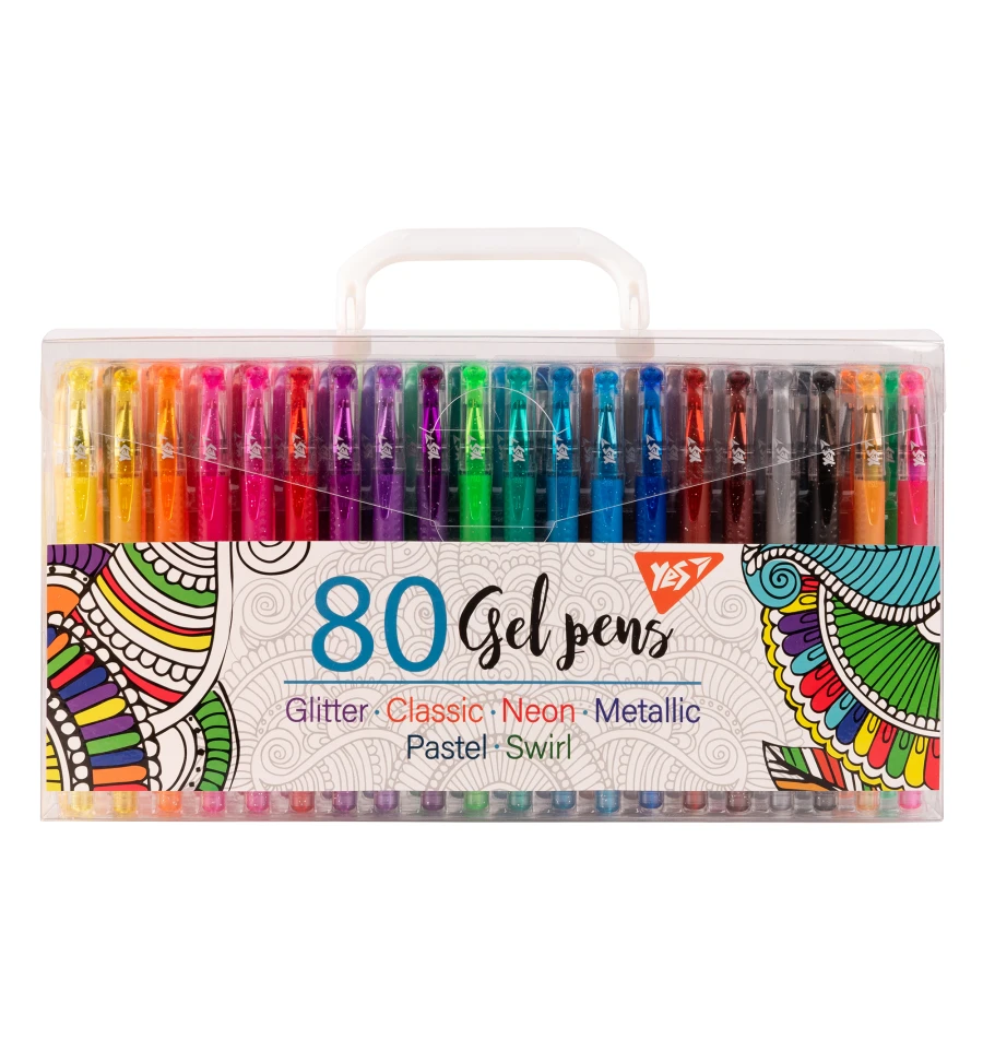 У наборі 80 ручок – 80 яскравих кольорів чорнила. Насолоджуйтесь яскравими кольорами із гелевими ручками. Вони призначені як для дітей, так і для дорослих. Підходять для створення різних малюнків, розмальовок, оформлення конспектів, журналів та щоденників. Ручки мають ергономічний прогумовий грип, що зменшить втому від довгого письма. У набір входять ручки з наступними ефектами: класичні – 13 шт., пастельні – 13 шт., неонові – 15 шт., металік – 18 шт., глітер – 21 шт. Товщина лінії письма: 0.8мм, 1.00 мм. Тривалий термін служби, легке письмо та завжди відмінна якість – безперечні переваги ручок YES! Творіть із ручками YES!