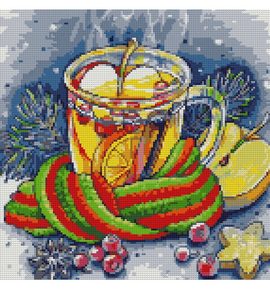 Алмазна мозаїка SANTI Ароматний чай у розділі натюрморт. Ягоди, фрукти та пряні трави в затишному шарфі.