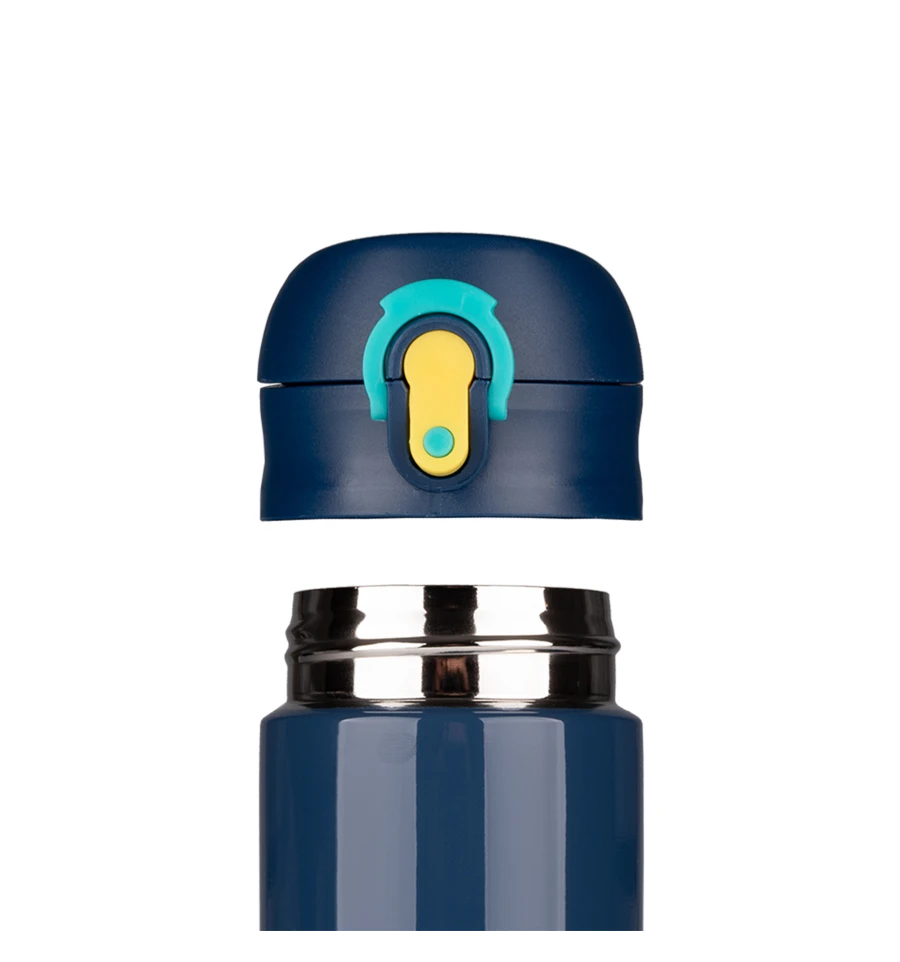 Відкидна кришка зручно відкривається однією рукою за допомогою кнопки, а додатковий фіксатор запобігає протіканню. Має силіконові елементи, що забезпечують герметичність.