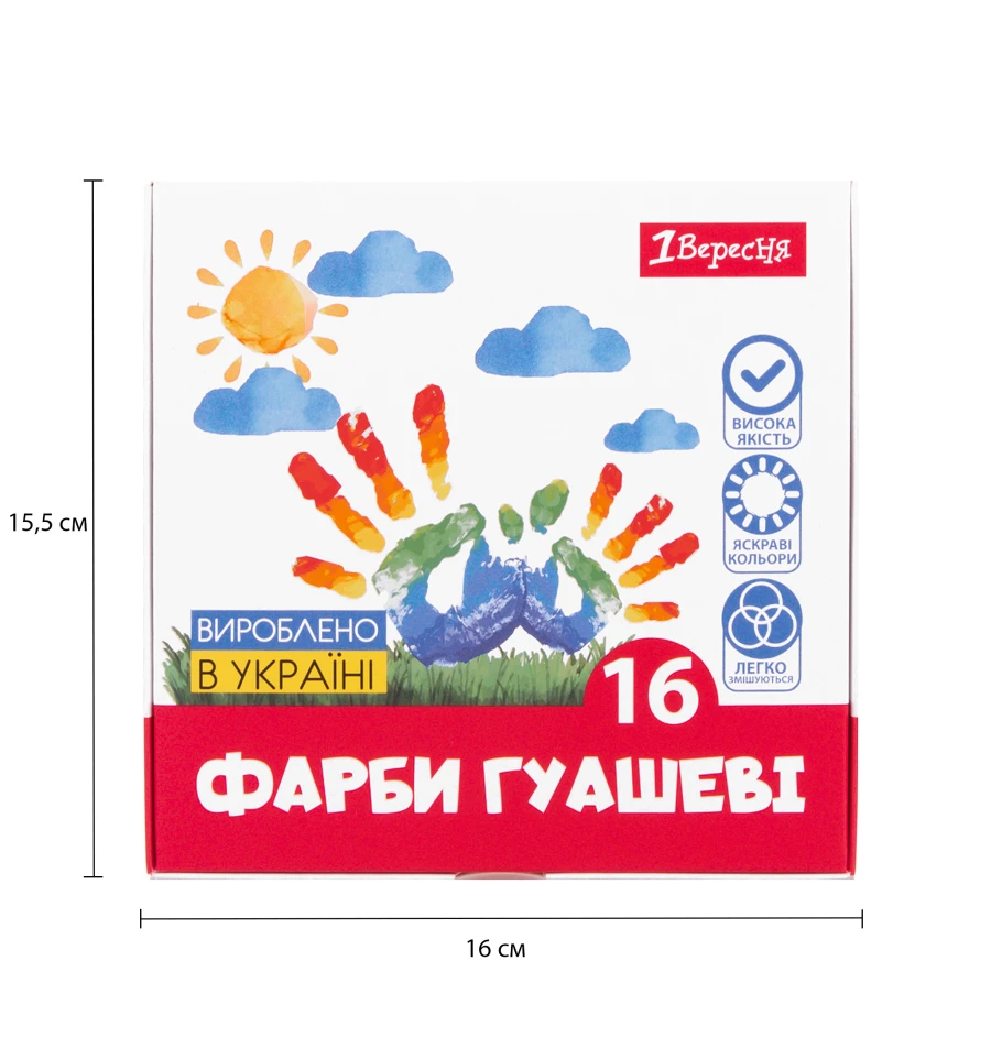 Гуашеві фарби 1Вересня - прекрасне доповнення до художніх інструментів для реалізації творчих задумів. Призначені для дитячої творчості та виконання художньо-декоративних робіт. Висока концентрація пігментів дозволяє легко створювати яскраві та насичені малюнки. Фарба має відмінну покриваність, при висиханні не вицвітає, набуває бархатистої поверхні. Гармонійний склад набору з 16 кольорів забезпечує оптимальні поєднання.