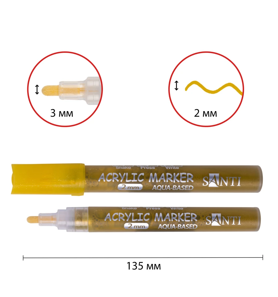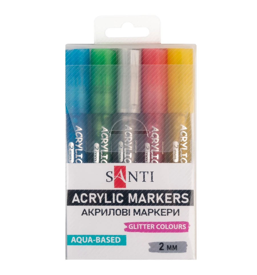 Акрилові маркери ТМ SANTI мають унікальні фізичні характеристики. Крім яскравого насиченого кольору, вони мають високу стійкість до вологи та дозволяють ідеально виконувати творчу роботу, де важлива чіткість ліній. Після нанесення фарби лінія має однорідну чітку форму і не розтікається.