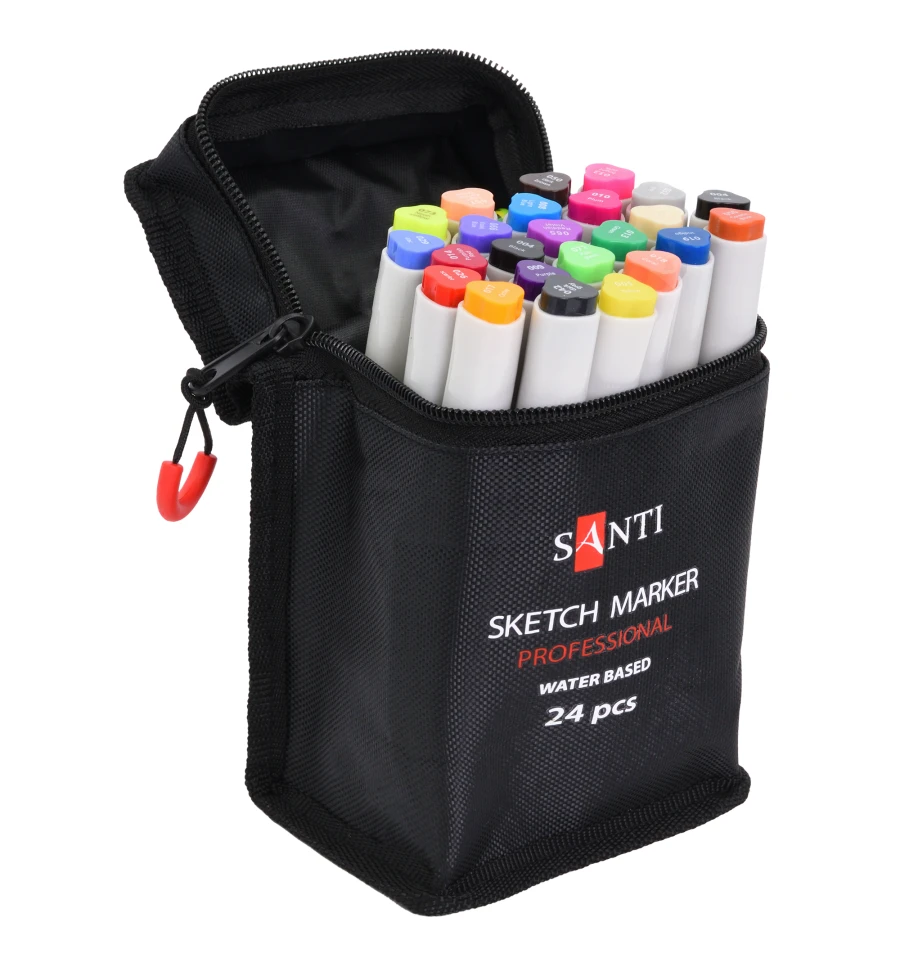 Скетч-маркери SANTI - це безмежні можливості для ваших малюнків! Широка палітра кольорів вразить навіть досвідчених художників. В наборі 24 шт. Водорозчинні, світлостійкі чорнила призначені для живопису і малювання в змішаних техніках. Поєднують в собі властивості маркерів і акварельних фарб. Для досягнення акварельного ефекту можна розмити деталі малюнка за допомогою змоченого водою пензля на папері або розбавити водою чорнило на палітрі. Оснащені двома видами наконечників: м‘який пензель для точної деталізації малюнка і долото - для заповнення великих фрагментів. Для роботи можна використовувати акварельний папір або спеціальний папір для малювання маркерами.