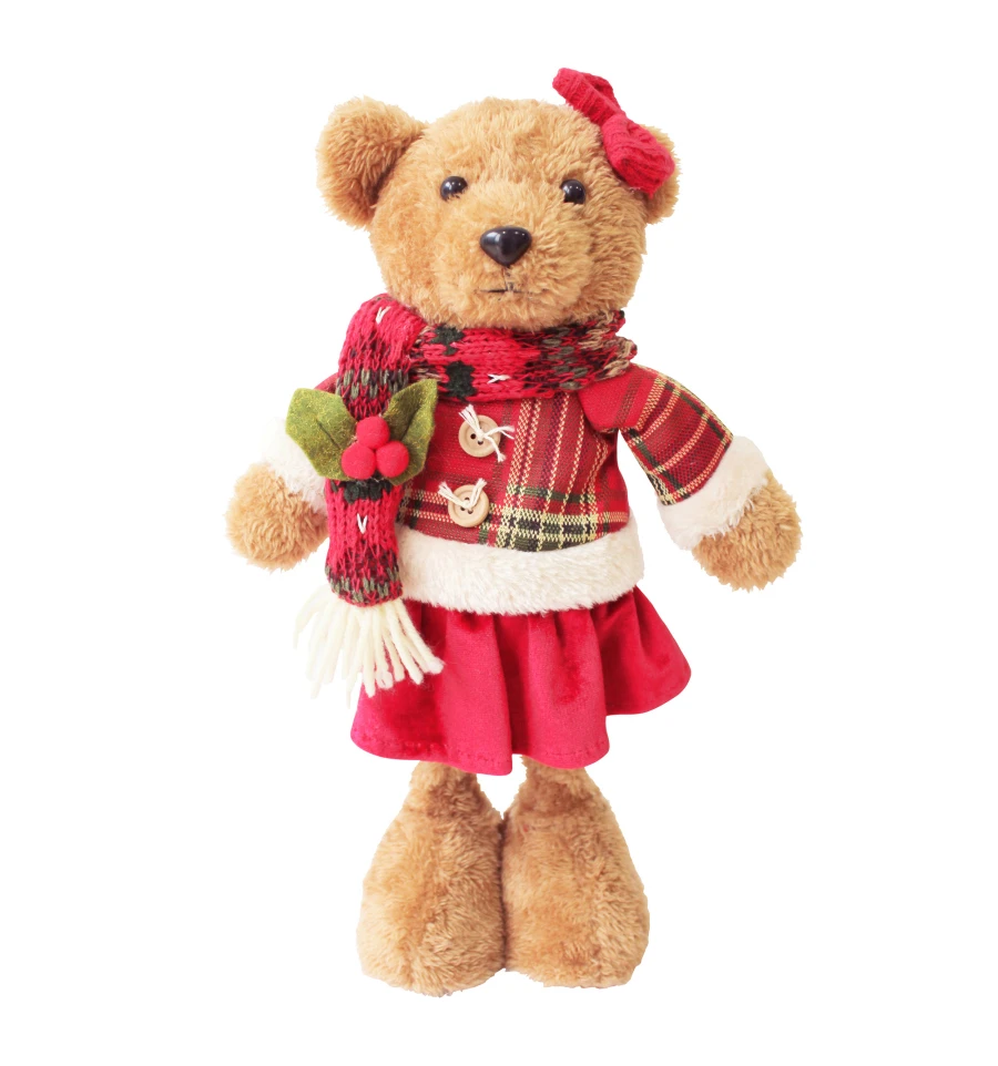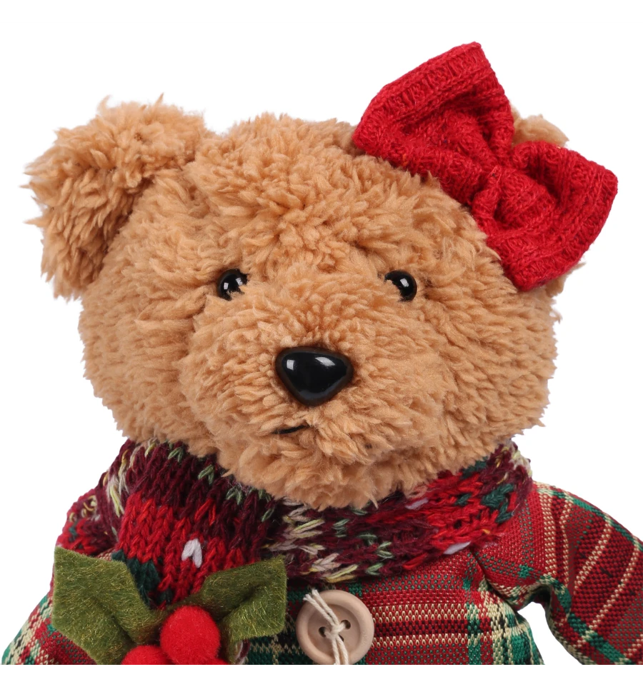 М‘яка іграшка ведмежа дівчинка ТМ Yes! Fun одягнена в стильне святкове вбрання: затишний картатий светр з декоративними ґудзиками, червону оксамитову спідничку та теплий шарф з гілочкою гостролиста та ягідками. На вушці — милий червоний бантик, що підкреслює її ніжний та святковий образ. М‘яка пухнаста вовна робить іграшку особливо приємною на дотик, а добра мордочка викликає у дітей і дорослих найтепліші емоції, щиру посмішку і створює милий новорічний образ, який сподобається і дітям, і дорослим.