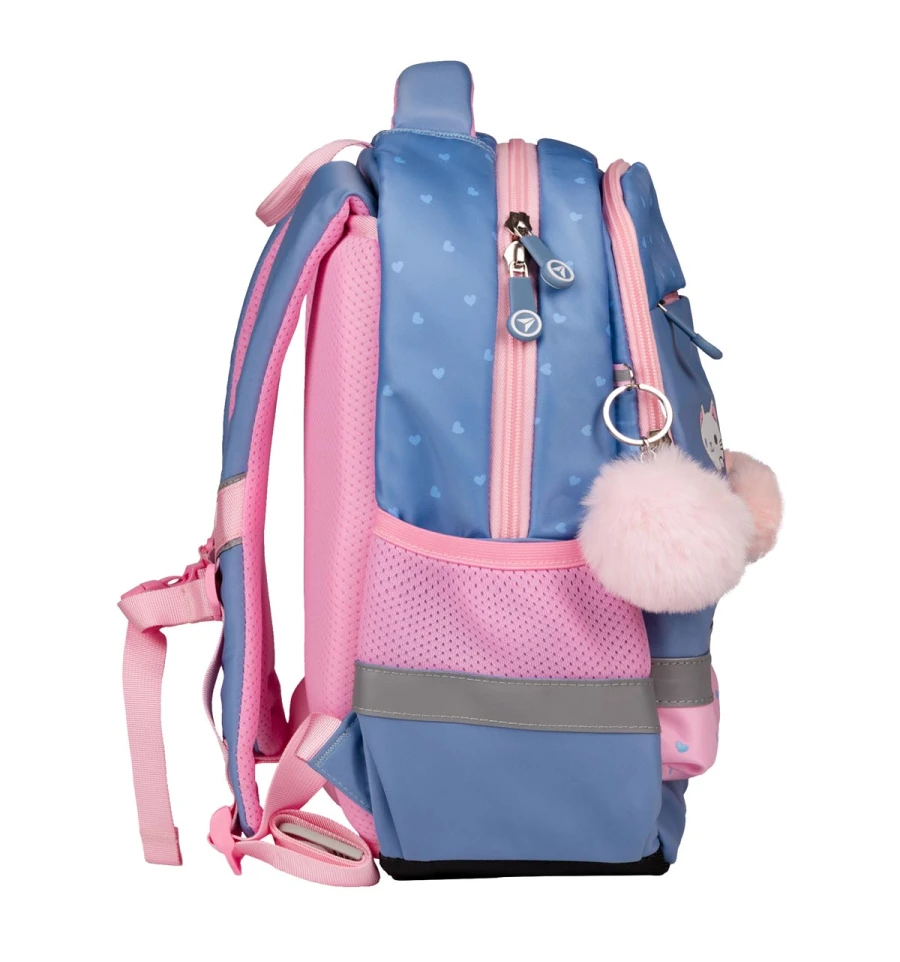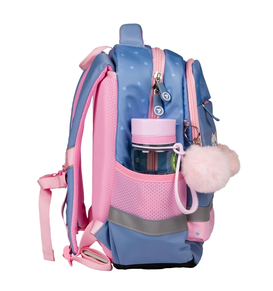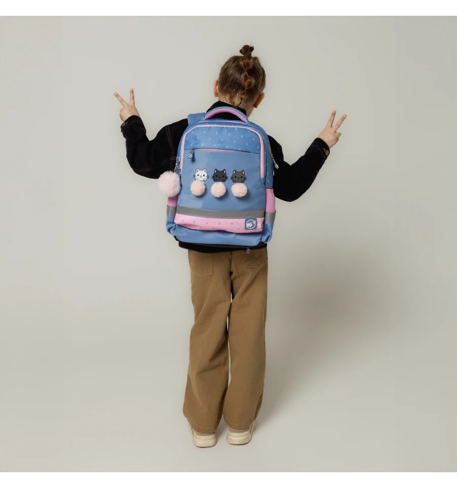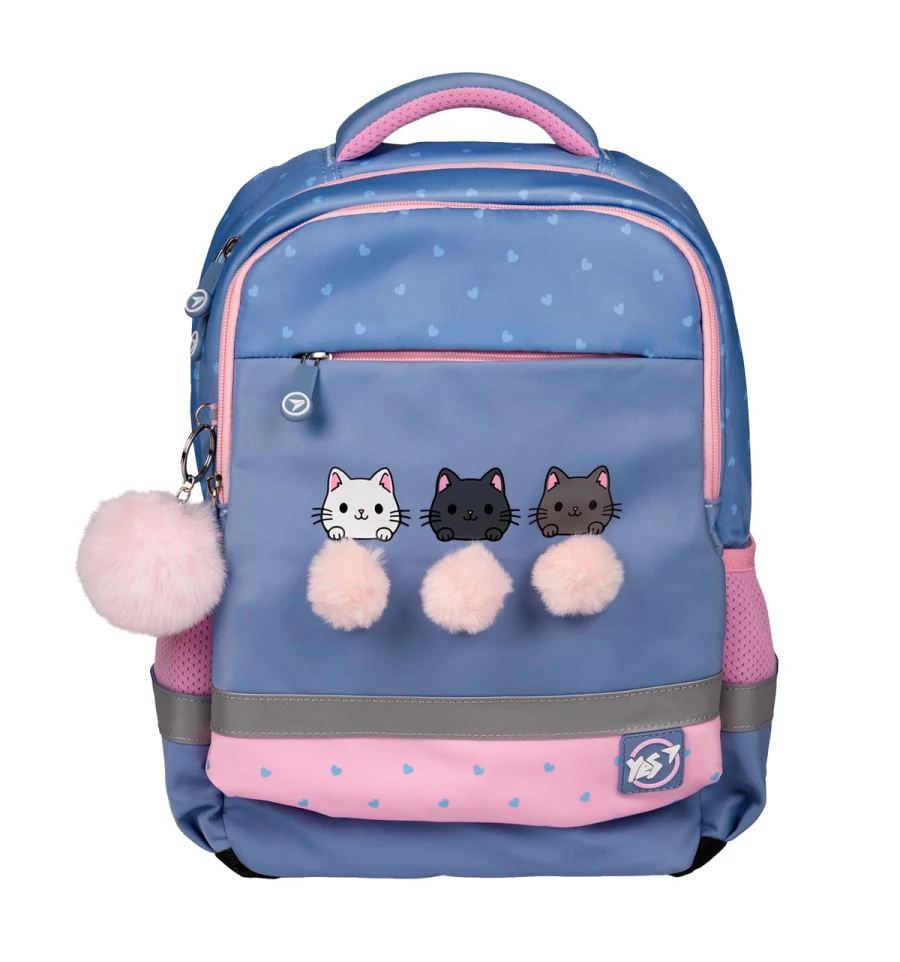 Приємне поєднання блакитного та рожевого кольорів шкільного рюкзака YES S-52 Ergo Fluffy Cats з патерном сердець, брелок з ніжним рожевим помпоном та принт котиків подарують почуття щастя та тепла маленькій школярці.