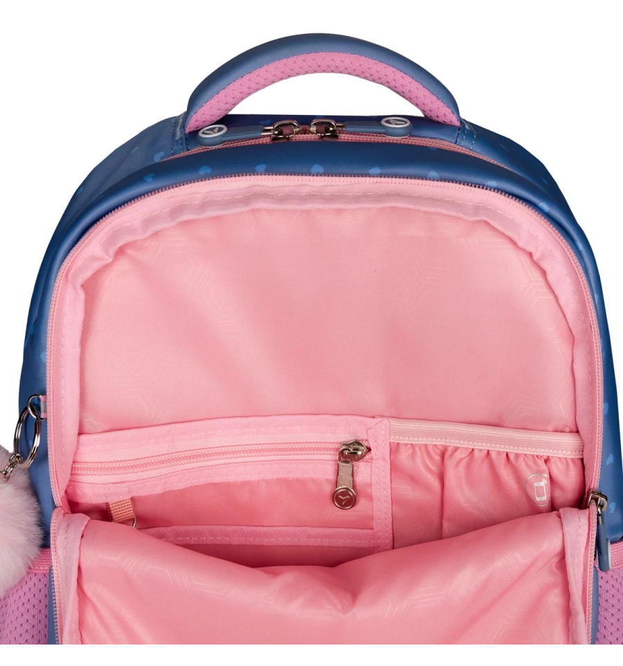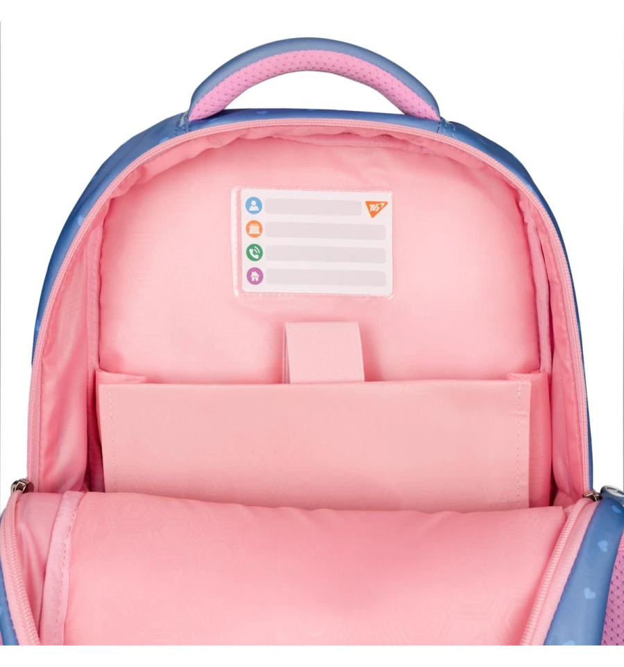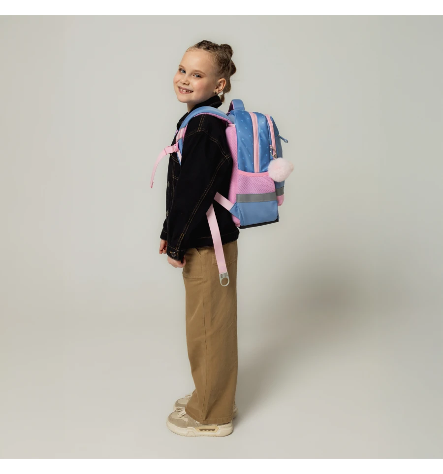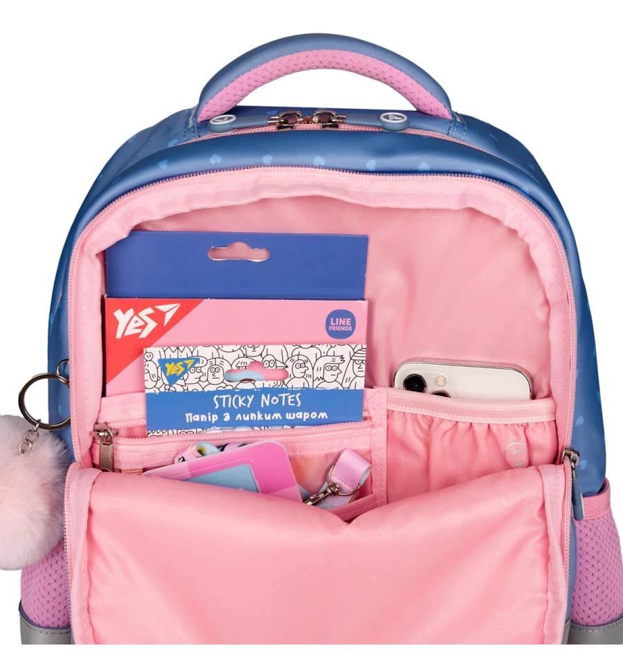 Приємне поєднання блакитного та рожевого кольорів шкільного рюкзака YES S-52 Ergo Fluffy Cats з патерном сердець, брелок з ніжним рожевим помпоном та принт котиків подарують почуття щастя та тепла маленькій школярці.
