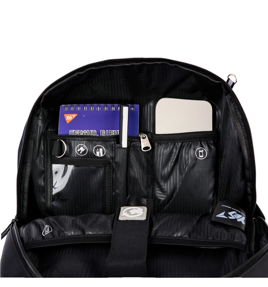 Незважаючи на досить компактний розмір, рюкзак Т-105 від торгової марки Yes достатньо функціональний. Рюкзак має одне містке відділення з органайзером всередині, в якому дуже зручно можна розмістити канцелярське приладдя, гаманець, пропуск, ID картку або інші документи. Кишені для мобільного телефону та планшету мають флісову підкладку, яка захищає гаджети від випадкових подряпин. Металеве півкільце передбачає можливість підвішування ключниці.
