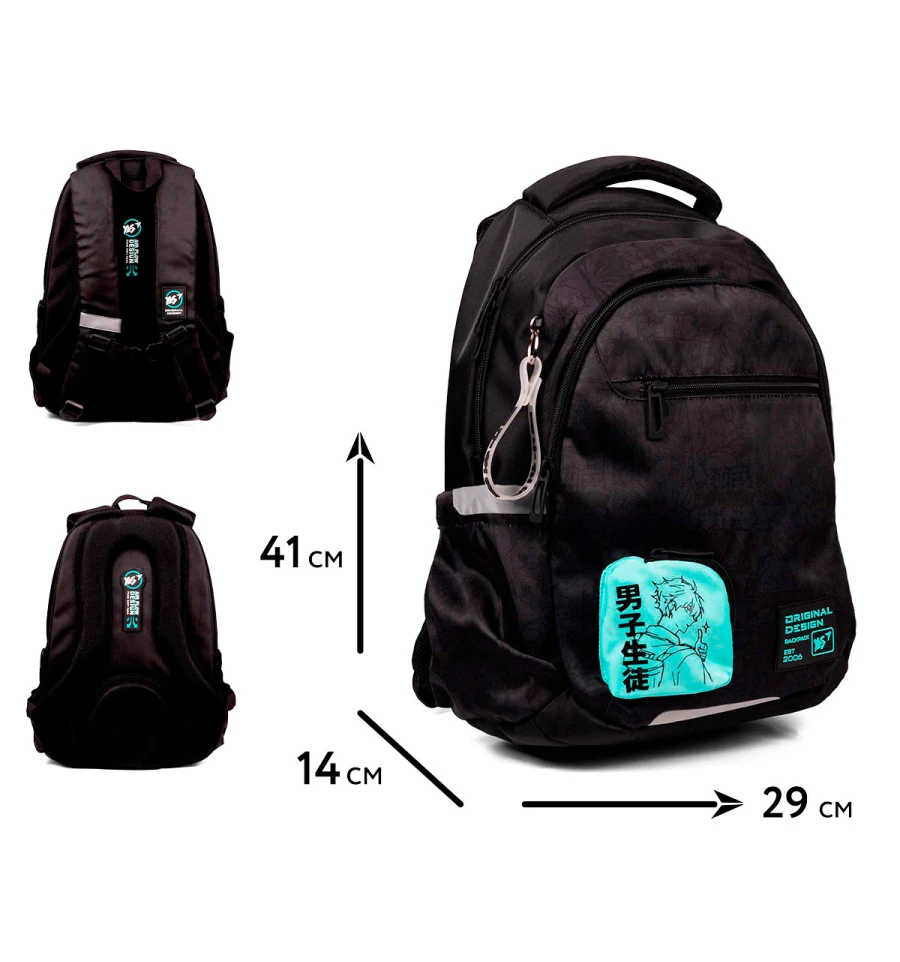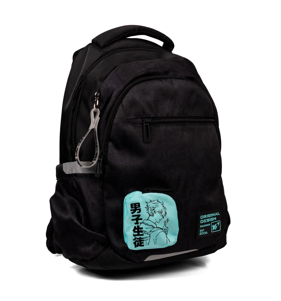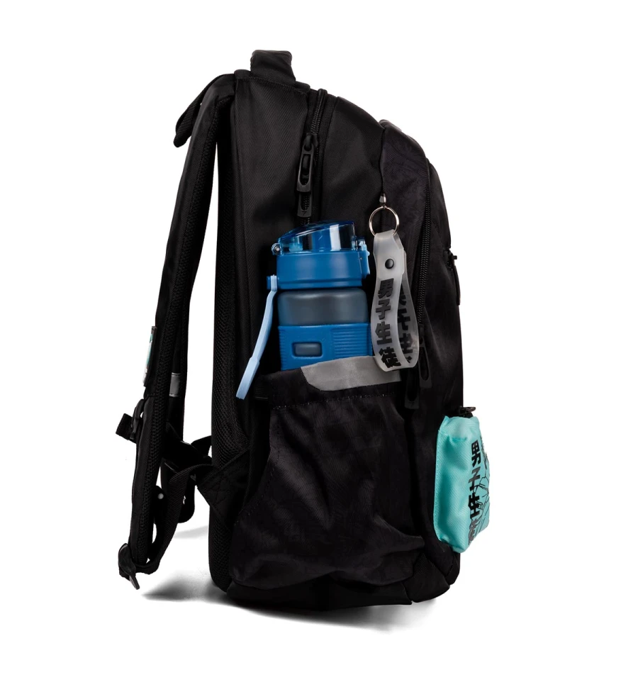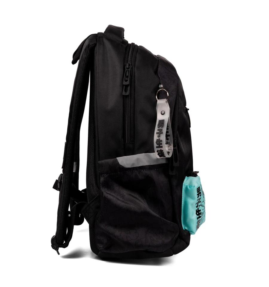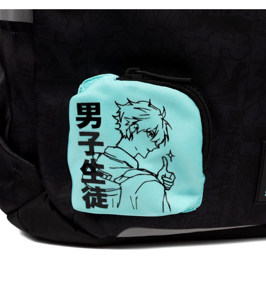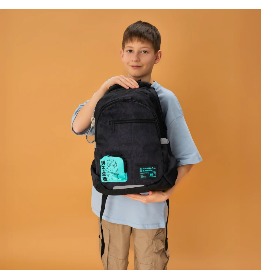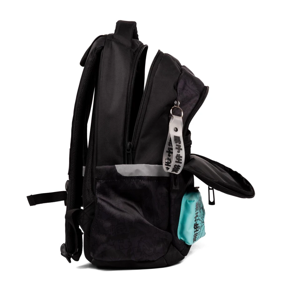 Стильний чорний рюкзак з аніме персонажем на додатковій кишеньці та тематичним брелоком неодмінно вподобають підлітки.