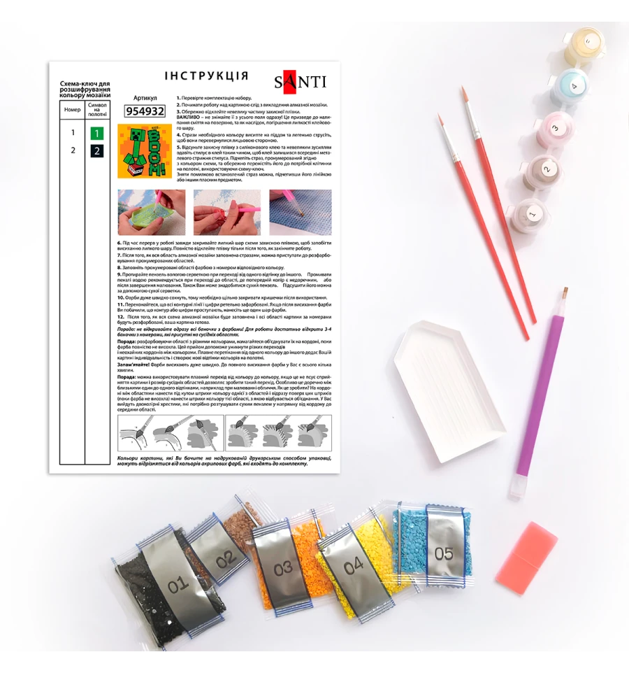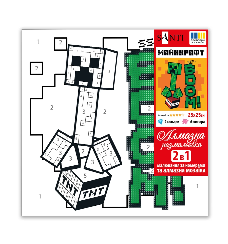 Набір для творчості ТМ SANTI "Майнкрафт. Кріпер БУУМ!" - це захоплююче заняття та мальовничий шедевр з елементами блискучої алмазної мозаїки. Картина за номерами з алмазною мозаїкою спеціально адаптована для дітей: прості схеми, яскраві кольори та чіткі пронумеровані контури на полотні допоможуть дитині легко орієнтуватися у процесі малювання. Такий формат також сприяє швидкому освоєнню та запам‘ятовування цифр в ігровій формі — дитина асоціюватиме їх з яскравими фарбами та елементами малюнка, що робить навчання простим та веселим. У наборі використовуються акрилові фарби, вони легко лягають на полотно, швидко висихають, дозволяючи дитині побачити результат одразу після завершення роботи. Часткове оздоблення окремих елементів зображення за допомогою алмазної мозаїки оживить зображення та створить приголомшливий 3D-ефект. Готове зображення виходить об‘ємним і блискучим, перетворюючись на справжню прикрасу інтер‘єру.