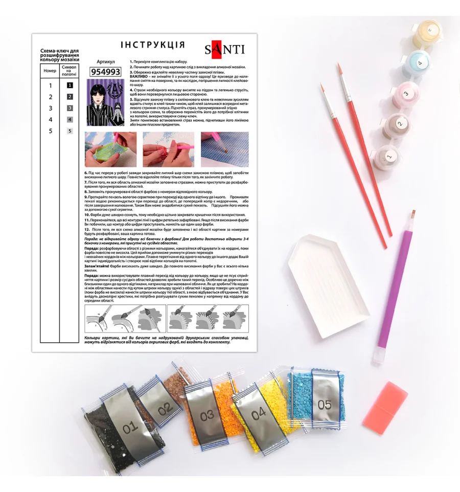 У наборі для творчості з алмазною мозаїкою Венздей. Готичний дует ТМ SANTI представлені улюблені та відомі персонажі серіалу Венздей, які перетворюють творчий процес на захоплюючу пригоду. Дитина із захопленням порине в роботу, отримає радість від створення картини своїми руками і з гордістю прикрасить нею свою кімнату. Готова мозаїка не потребує додаткового оформлення – вона одразу готова зайняти місце в інтер‘єрі або стати оригінальним подарунком для шанувальників серіалу.