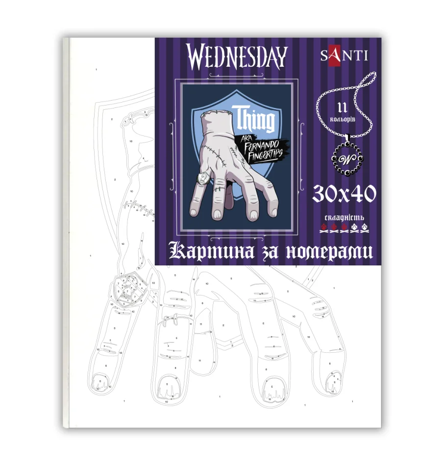 Картина за номерами ТМ SANTI Wednesday. Thing Hand - це можливість створити мальовничий шедевр без спеціальної підготовки. Точні пронумеровані контури на полотні допоможуть легко орієнтуватися у процесі малювання. У наборі використовуються акрилові фарби, вони легко лягають на полотно, швидко висихають, дозволяючи побачити результат відразу після завершення роботи. Набір для творчості виготовлений з натуральних, екологічно чистих матеріалів, що робить малювання комфортним та безпечним.