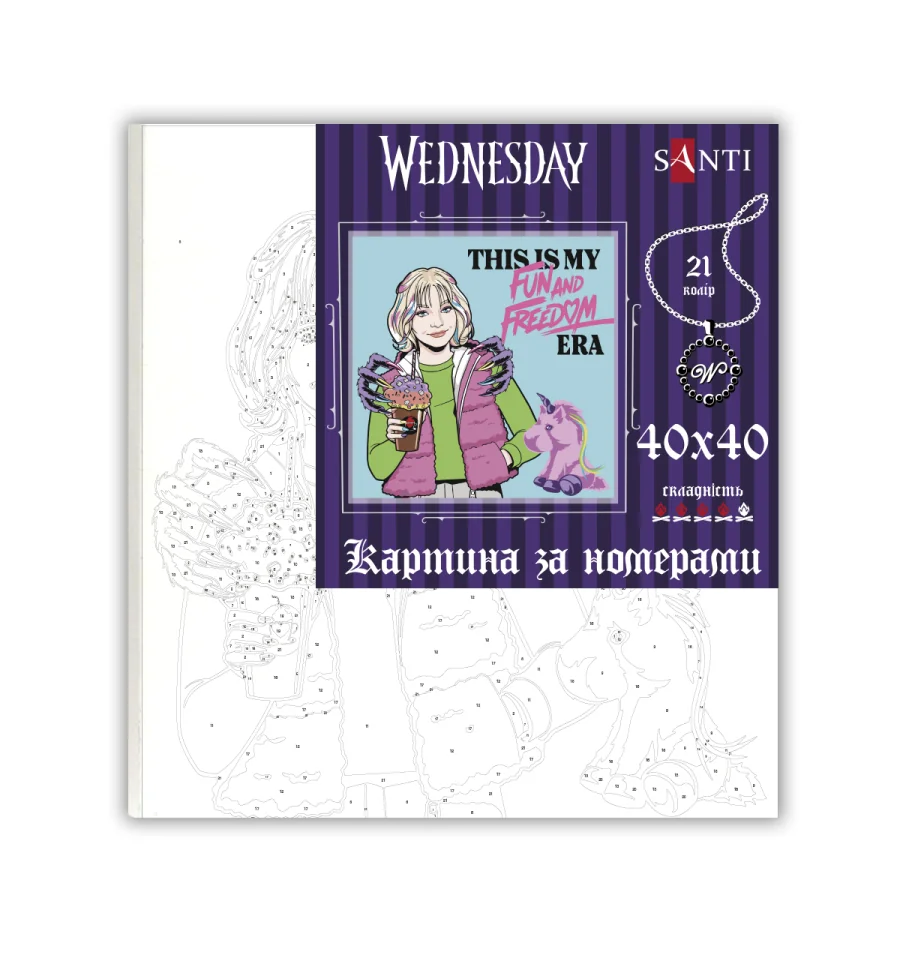 У кожній картині за номерами ТМ SANTI представлені цікаві та знайомі персонажі серіалу Венздей, які перетворюють малювання на цю пригоду. Дитина не тільки отримає задоволення від творчого процесу, а й зможе з гордістю прикрасити свою кімнату власним шедевром із улюбленими персонажами!