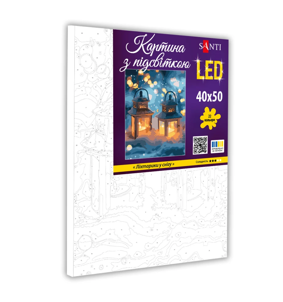 Відчути себе справжнім художником можливо навіть якщо ви ніколи не брали до рук пензель. Картини за номерами від бренду SANTI з LED підсвіткою створені саме для того, щоб ви захоплююче провели свій час, розвинули творчі здібності та отримали чудовий витвір мистецтва, створений власноруч. Набір для малювання SANTI допоможе створювати дивовижні сюжети, слідуючи пронумерованим контурам на полотні та використовуючи якісні акрилові фарби.