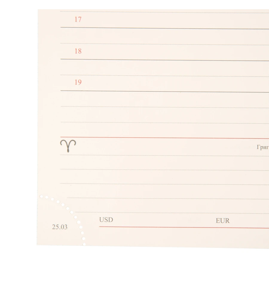 Паперовий блок продуманий до дрібниць для комфортного щоденного користування. Він налічує 368 сторінок, що забезпечує достатньо простору для щоденних записів, планів і нотаток. Папір щільністю 80 г/м² дозволяє комфортно писати ручкою чи олівцем без просвічування. Кремовий папір не втомлює очі навіть за тривалої роботи. Перфоровані кути паперового блока дозволяють легко маркувати актуальну сторінку. Це зручний функціональний елемент, що допомагає швидко орієнтуватися у записах та тримати планування під контролем. Паперовий зріз у колір паперового блока – стримане класичне рішення, що підтримує загальну гармонію дизайну. Ідеально для тих, хто надає перевагу мінімалізму.