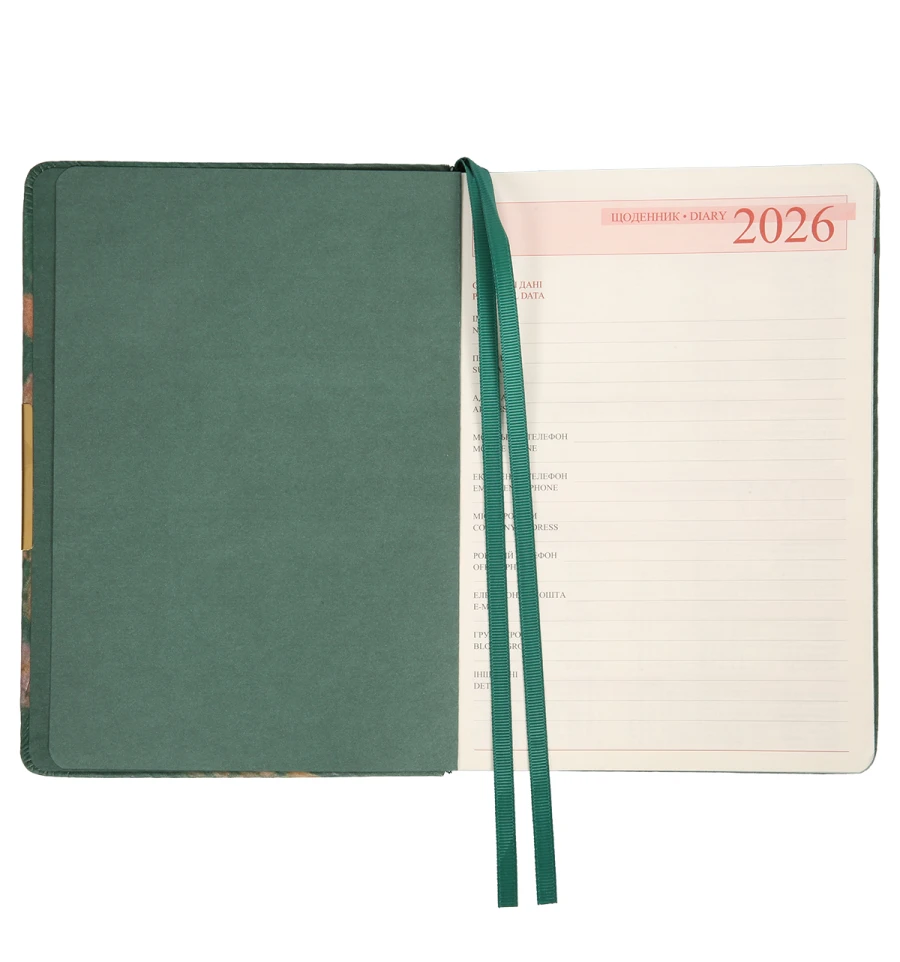 Тверда обкладинка забезпечує надійний захист вмісту та стійкість до щоденного використання. Ідеальний варіант для тих, хто цінує міцність, стабільність та практичність. Тканинна обкладинка з особливою фактурою підкреслює вашу унікальнісь та дуже приємна на дотик. Металевий декор з блискучим золотистим відтінком елегантно контрастує з матовою обкладинкою оксамитової текстури. Обкладинка з повнокольоровим друком з фольгою поєднує яскравий дизайн і блискучі акценти та створює преміальний вигляд.