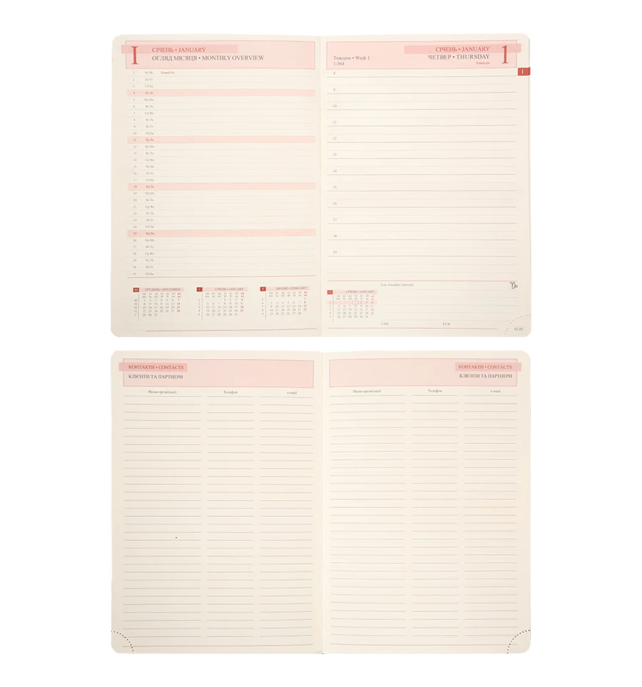Паперовий блок продуманий до дрібниць для комфортного щоденного користування. Він налічує 368 сторінок, що забезпечує достатньо простору для щоденних записів, планів і нотаток. Папір щільністю 80 г/м² дозволяє комфортно писати ручкою чи олівцем без просвічування. Кремовий папір не втомлює очі навіть за тривалої роботи. Закруглені кути паперового блока не лише додають стильного вигляду, а й запобігають швидкому зношенню сторінок. Це практичне рішення для збереження ділового записника охайним у щоденному користуванні. Перфоровані кути паперового блока дозволяють легко маркувати актуальну сторінку. Це зручний функціональний елемент, що допомагає швидко орієнтуватися у записах та тримати планування під контролем. Кольоровий паперовий зріз додає дизайнерського акценту та візуальної виразності. Стильне рішення для тих, хто цінує оригінальність.