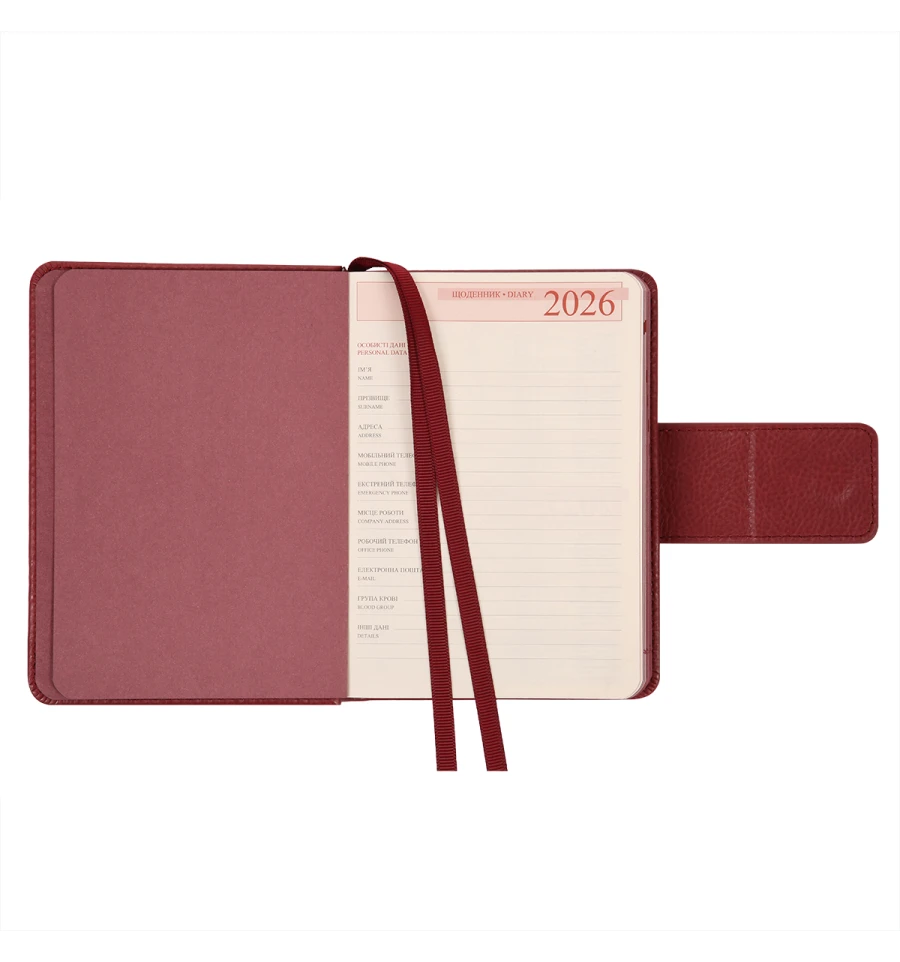 Тверда обкладинка забезпечує надійний захист вмісту та стійкість до щоденного використання. Ідеальний варіант для тих, хто цінує міцність, стабільність та практичність. Текстурне PU обкладинки стильно та сучасно доповнює дизайн щоденника завдяки вираженій фактурі. Такий матеріал не лише стійкий до зношування, але й підкреслює унікальний смак будь-якої ділової натури. Магнітний клапан з металевим декором забезпечує надійну фіксацію у закритому положенні та підкреслює преміальний характер виробу. Магніт фіксує обкладинку м’яко та безшумно, без додаткових зусиль. Можливість персоналізації у вигляді сліпого тиснення або тиснення фольгою – ефектне рішення для створення унікального стилю на ваш вибір. Для даного щоденника використовується преміальний варіант пакування - індивідуальний картонний бокс, що додає виробу завершеного вигляду та перетворює його на готовий подарунок.