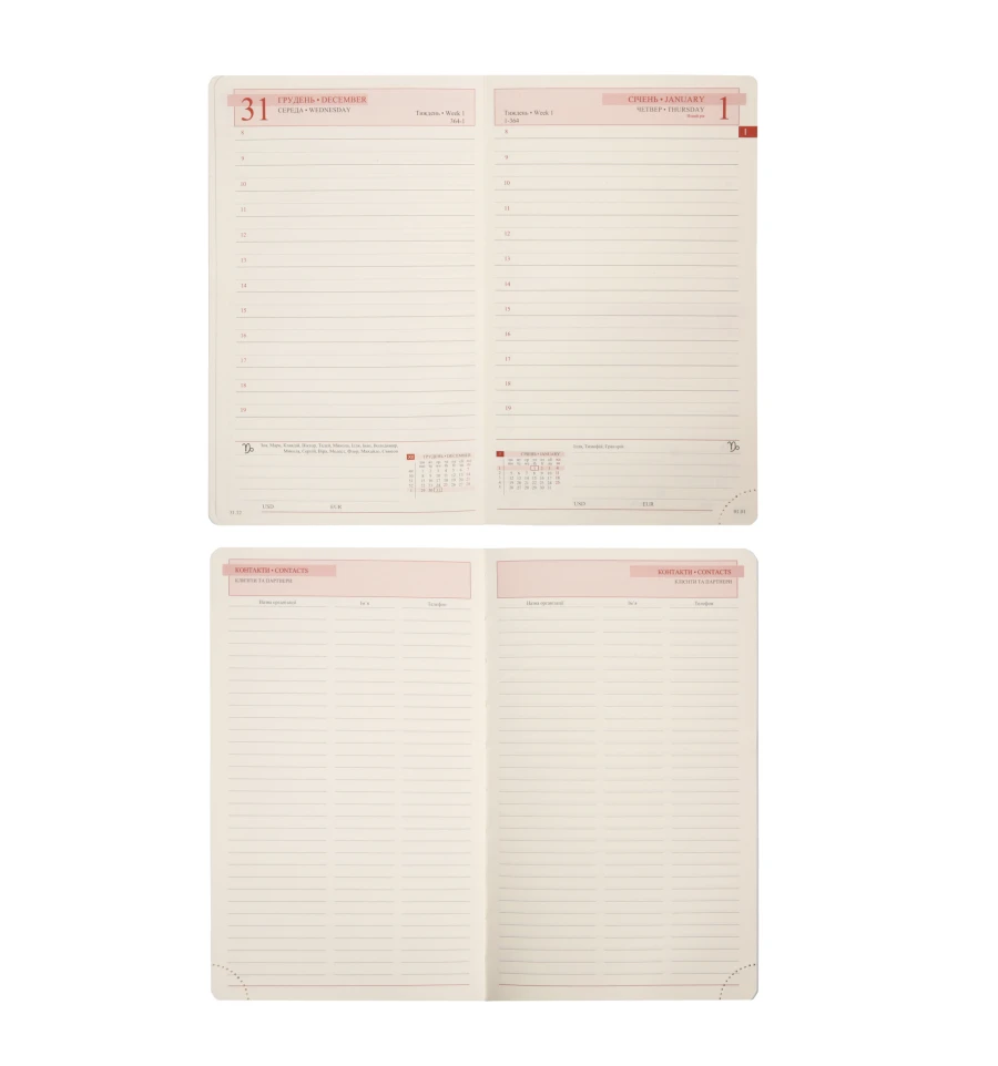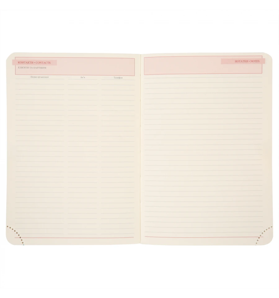Паперовий блок продуманий до дрібниць для комфортного щоденного користування. Він налічує 352 сторінок, що забезпечує достатньо простору для щоденних записів, планів і нотаток. Папір щільністю 80 г/м² дозволяє комфортно писати ручкою чи олівцем без просвічування. Кремовий папір не втомлює очі навіть за тривалої роботи. Закруглені кути паперового блока не лише додають стильного вигляду, а й запобігають швидкому зношенню сторінок. Це практичне рішення для збереження ділового записника охайним у щоденному користуванні. Перфоровані кути паперового блока дозволяють легко маркувати актуальну сторінку. Це зручний функціональний елемент, що допомагає швидко орієнтуватися у записах та тримати планування під контролем. Кольоровий паперовий зріз додає дизайнерського акценту та візуальної виразності. Стильне рішення для тих, хто цінує оригінальність.
