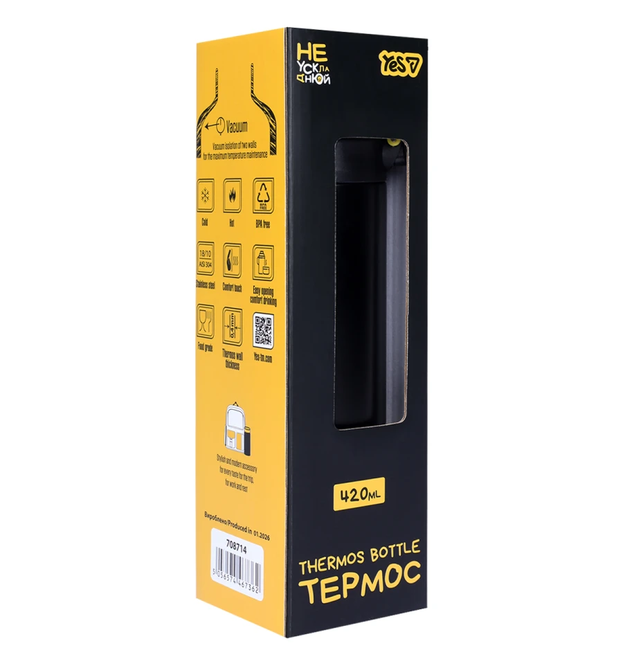 Термос торгової марки Yes Не ускладнюй! — практичний та надійний аксесуар для збереження температури напоїв у будь-яких умовах. Він стане у пригоді під час навчання, подорожей, прогулянок або щоденного використання.