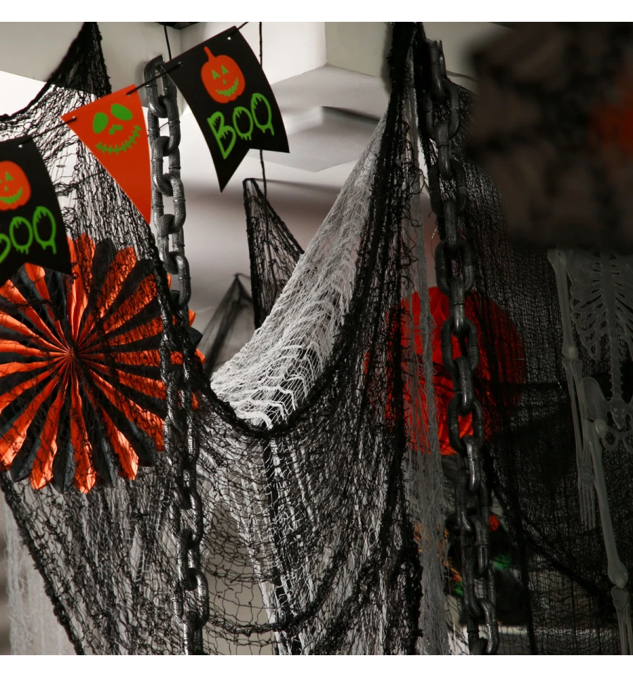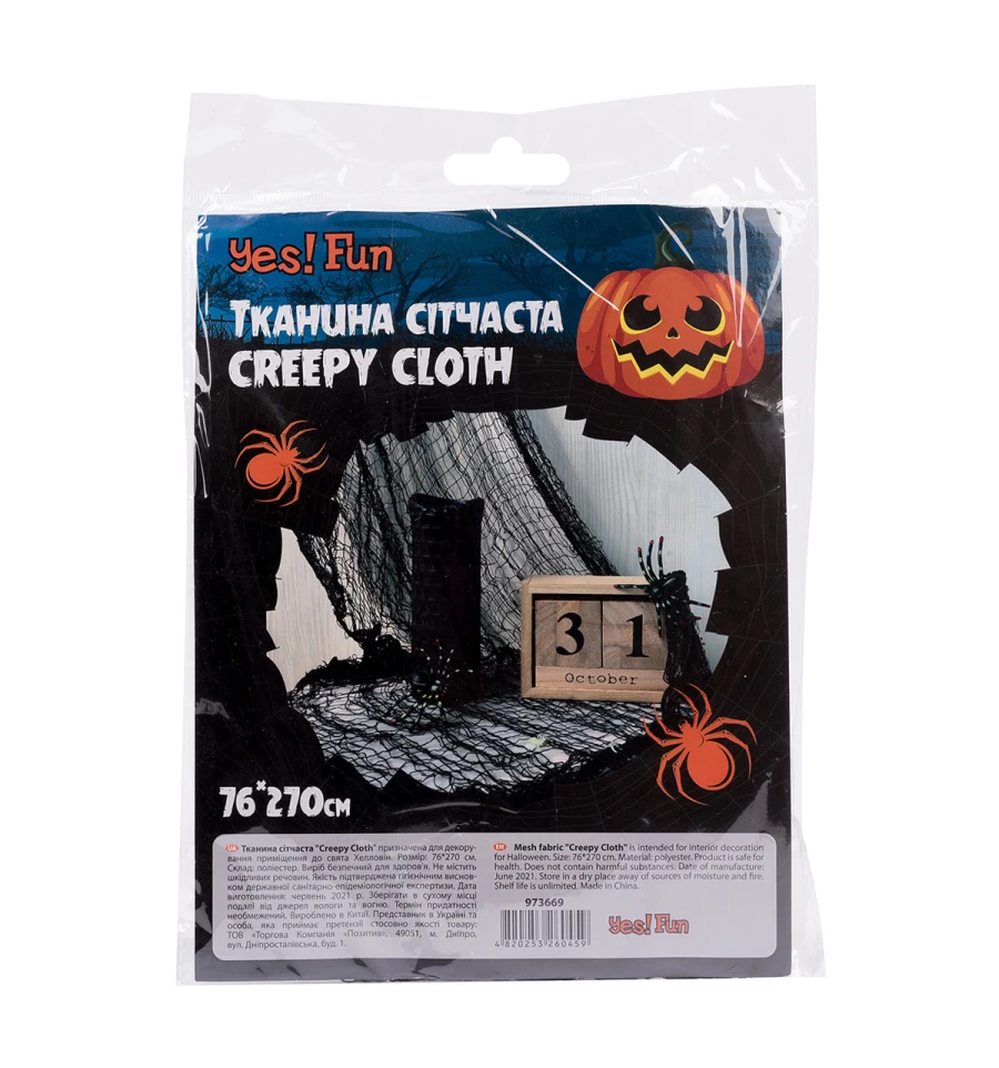 Тканина сітчаста "Creepy Cloth" призначена для декорування приміщення до Хелловіну, для створення загадкових композицій, а також може використовуватися як аксесуар до святкового образу. Розмір: 76х270 см. Склад: поліестер.
