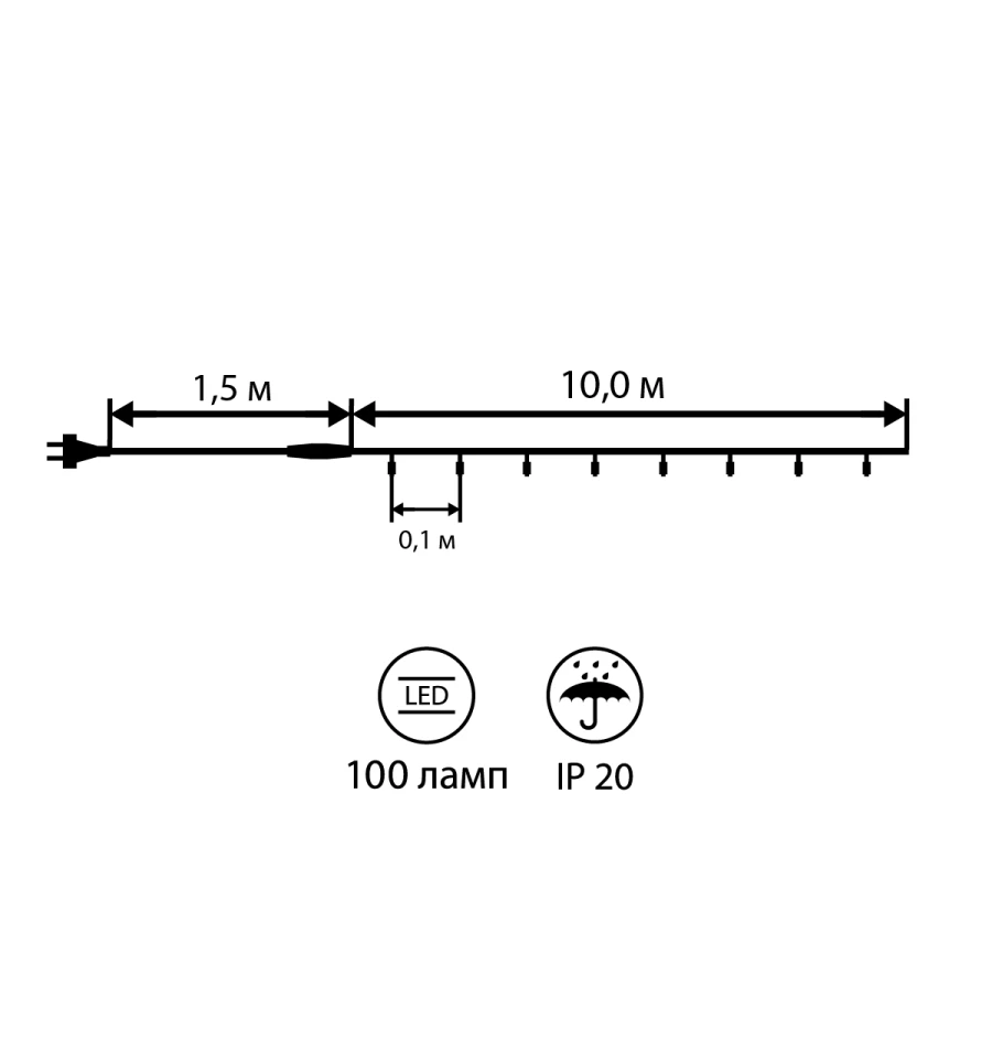 100 яскравих LED-лампочек рівномірно розташовані на робочій довжині 10,0 м, створюючи ефектне, кристально чисте сяйво. Холодне біле світло ідеально підходить для створення зимової, морозної атмосфери або сучасного мінімалістичного декору.
