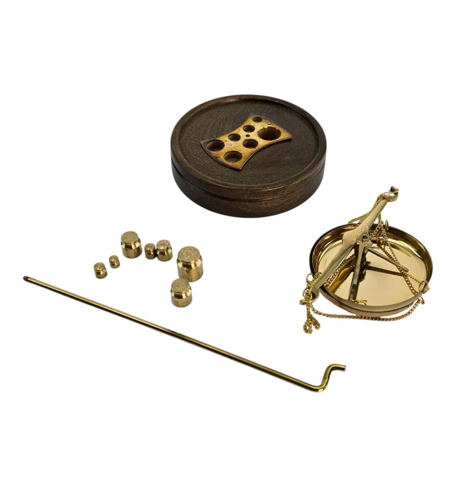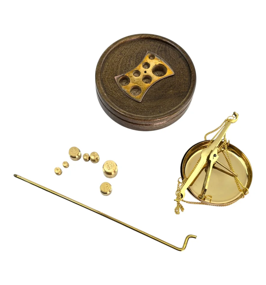 Класичні настільні ваги з латуні на дерев'яній основі поєднують функціональність та виразний зовнішній вигляд. Металеві елементи мають золотистий відтінок, основа виконана з натурального дерева. В комплект входить набір із 7 гирь різної ваги для точного зважування невеликих предметів. Компактні розміри дозволяють використовувати ваги в кабінеті, майстерні або як тематичний декор. Дві чаші діаметром 6,5 см забезпечують зручний та наочний процес вимірювання. Виготовлені в Індії із збереженням традиційної форми та конструкції.