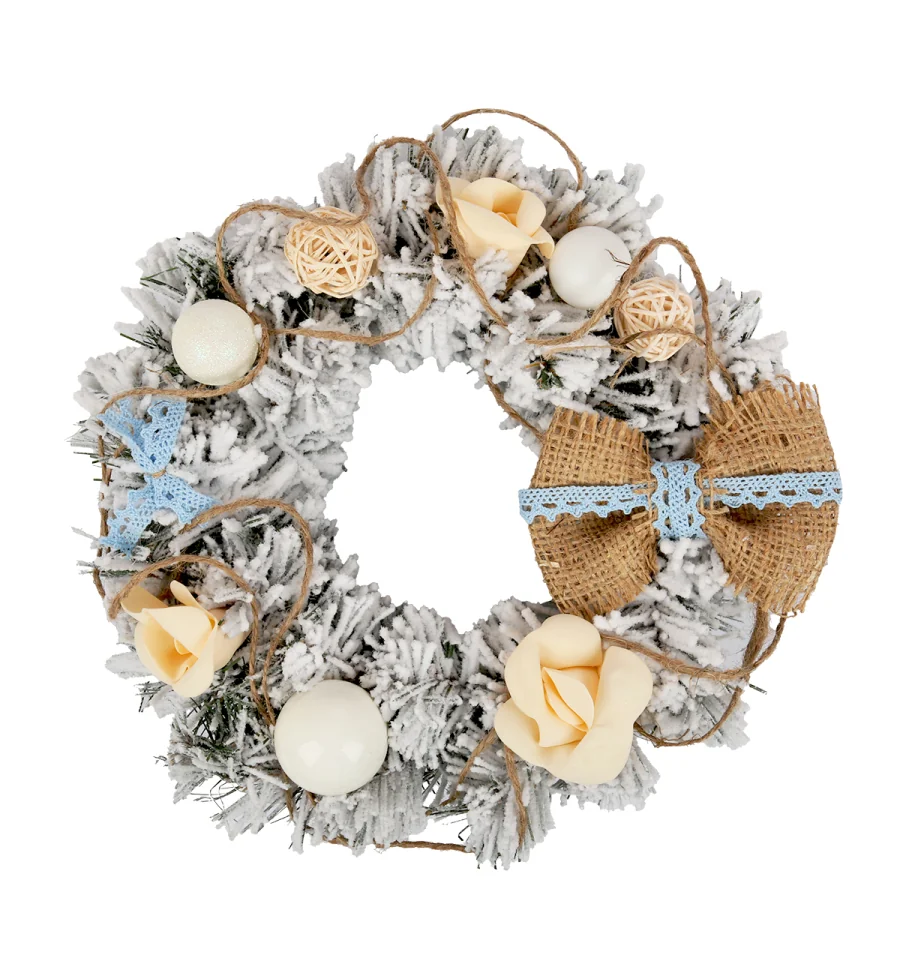 Оригінальний вінок з аксесуарами стане прекрасним декором для вхідних дверей будинку і офісу у період новорічних свят. Різдвяний вінок можна прикрашати зимовими ягодами, гілочками, пуансетією, ялинковими кулями і іншим декором. Всі матеріали екологічно чисті, мають протипожежні властивості. Висока якість матеріалу дозволяє виробу бути не тільки оригінальним і красивим, а ще й довговічним. Матеріал: ПВХ плівка зеленого кольору, дріт. Ширина хвої — 6 см. Діаметр: 15 см.