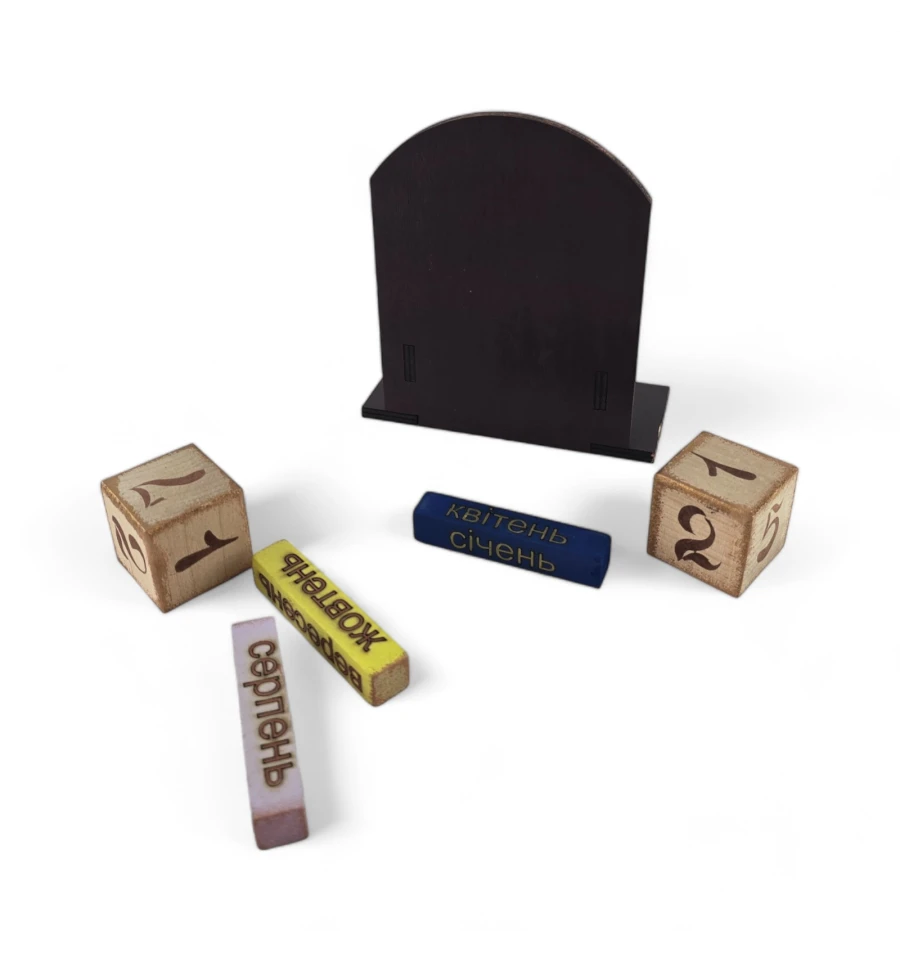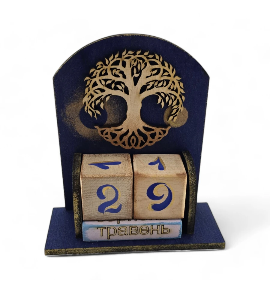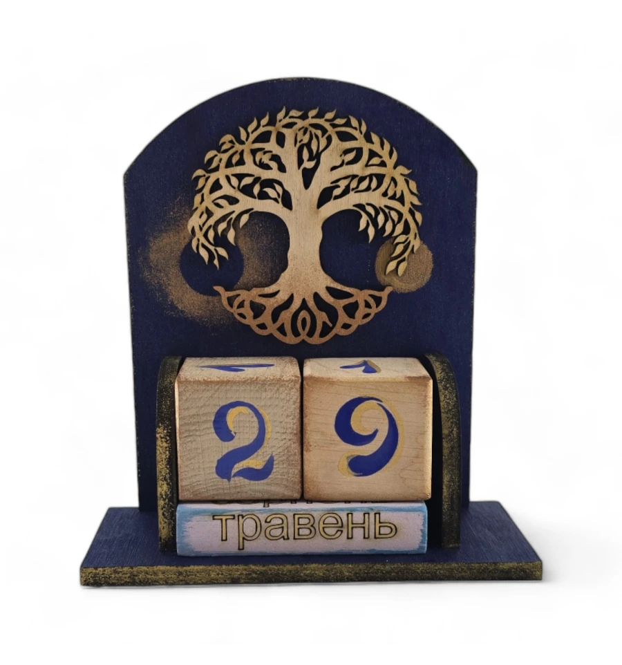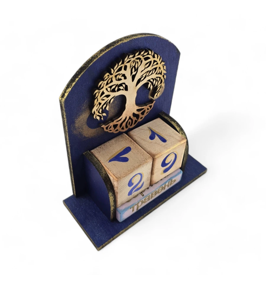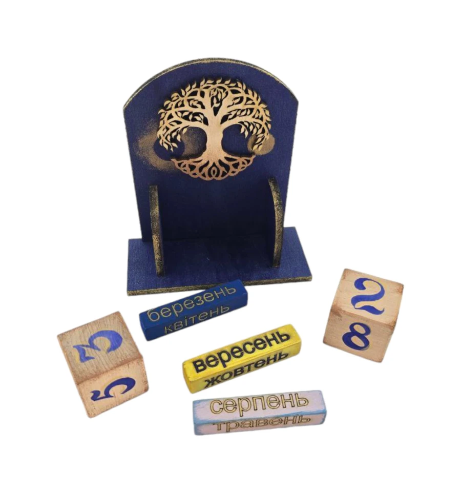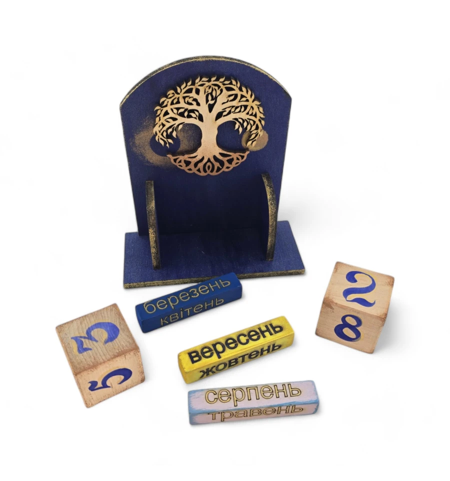 Древо Життя Цей календар із натурального дерева стане вашим вірним провідником у світі часу та символів. Кожен кубик, що відображає число місяця, зображення на кубиках з назвами місяців також відображає цей мотив, поєднуючи календар у єдине ціле, де кожен день і місяць стають частиною нескінченного потоку часу.