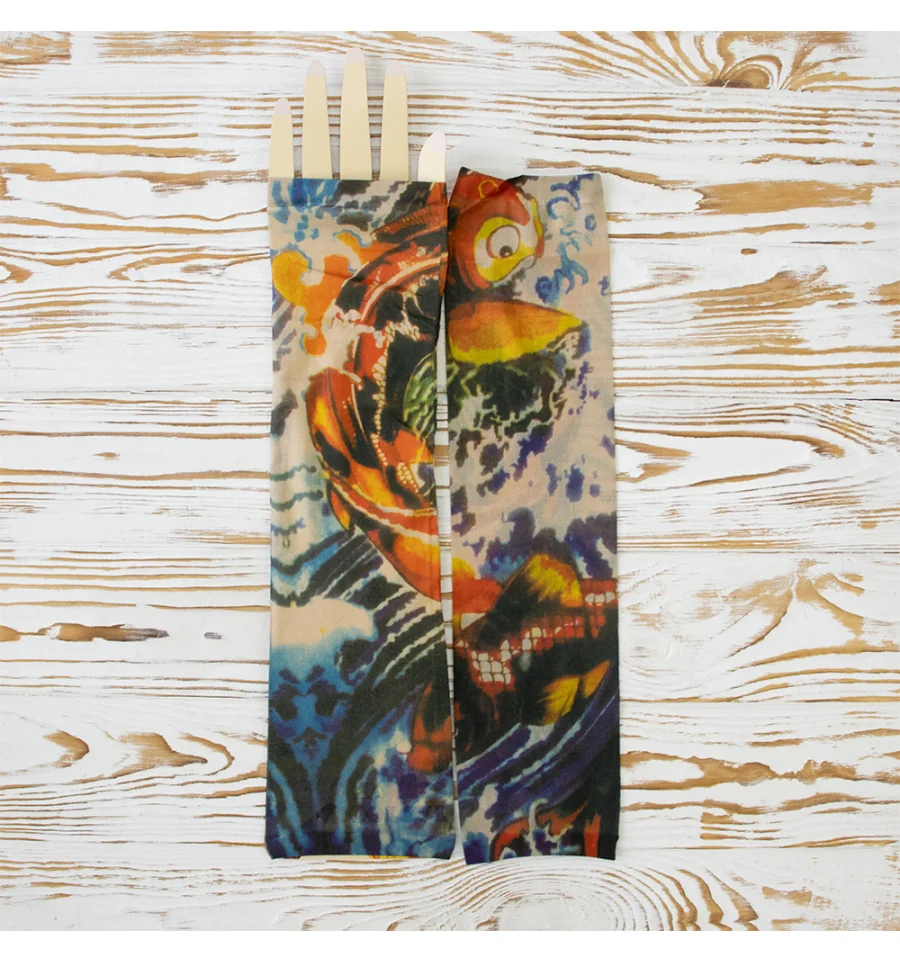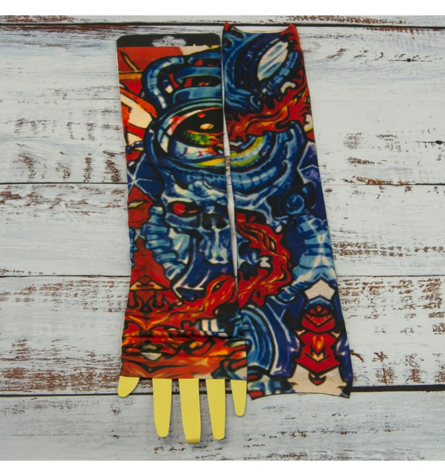 Ви мріяли про татуювання, але не могли наважитися? Бажаєте розширити асортимент Вашого магазину карнавальних аксесуарів? Тоді оптовий інтернет магазин PrazdnikShop пропонує купити нейлонові безшовні тату рукави з кольоровим малюнком. Тату рукава виготовлені з дихаючого матеріалу, за складом нагадує капрон з пористою структурою, завдяки чому шкіра під ними не потіє і не викликає подразнень. Мають універсальний розмір. Одягаються тату рукава від зап'ястя до плеча, поверх Ви можете одягати футболку або сорочку з лагідним рукавом. Знімні тату рукави реалістично виглядають на руці, створюючи враження ефектного татуювання. Рукави можна прати.
