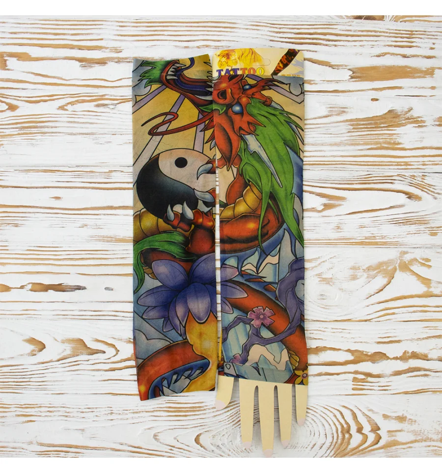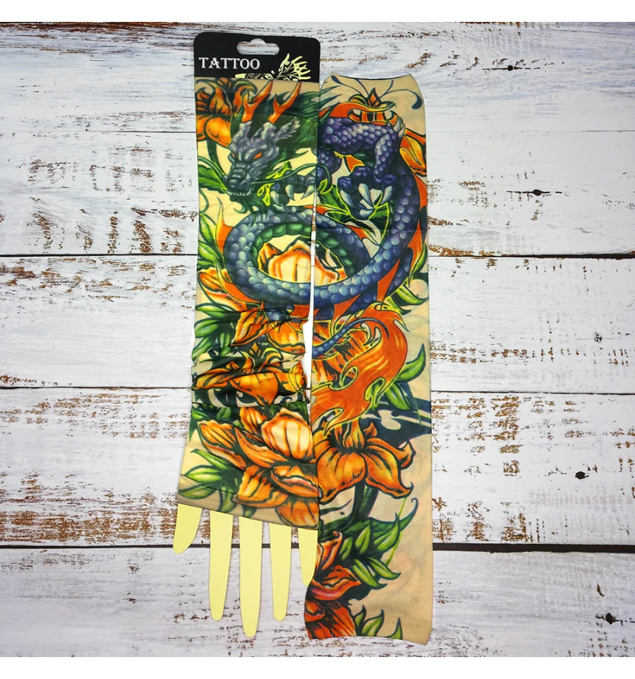Ви мріяли про татуювання, але не могли наважитися? Бажаєте розширити асортимент Вашого магазину карнавальних аксесуарів? Тоді оптовий інтернет магазин PrazdnikShop пропонує купити нейлонові безшовні тату рукави з кольоровим малюнком. Тату рукава виготовлені з дихаючого матеріалу, за складом нагадує капрон з пористою структурою, завдяки чому шкіра під ними не потіє і не викликає подразнень. Мають універсальний розмір. Одягаються тату рукава від зап'ястя до плеча, поверх Ви можете одягати футболку або сорочку з лагідним рукавом. Знімні тату рукави реалістично виглядають на руці, створюючи враження ефектного татуювання. Рукави можна прати.