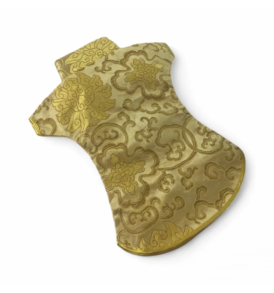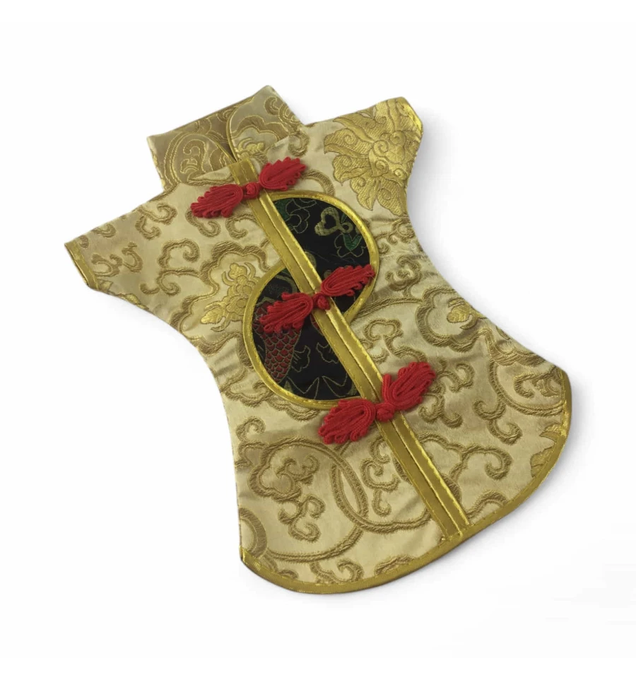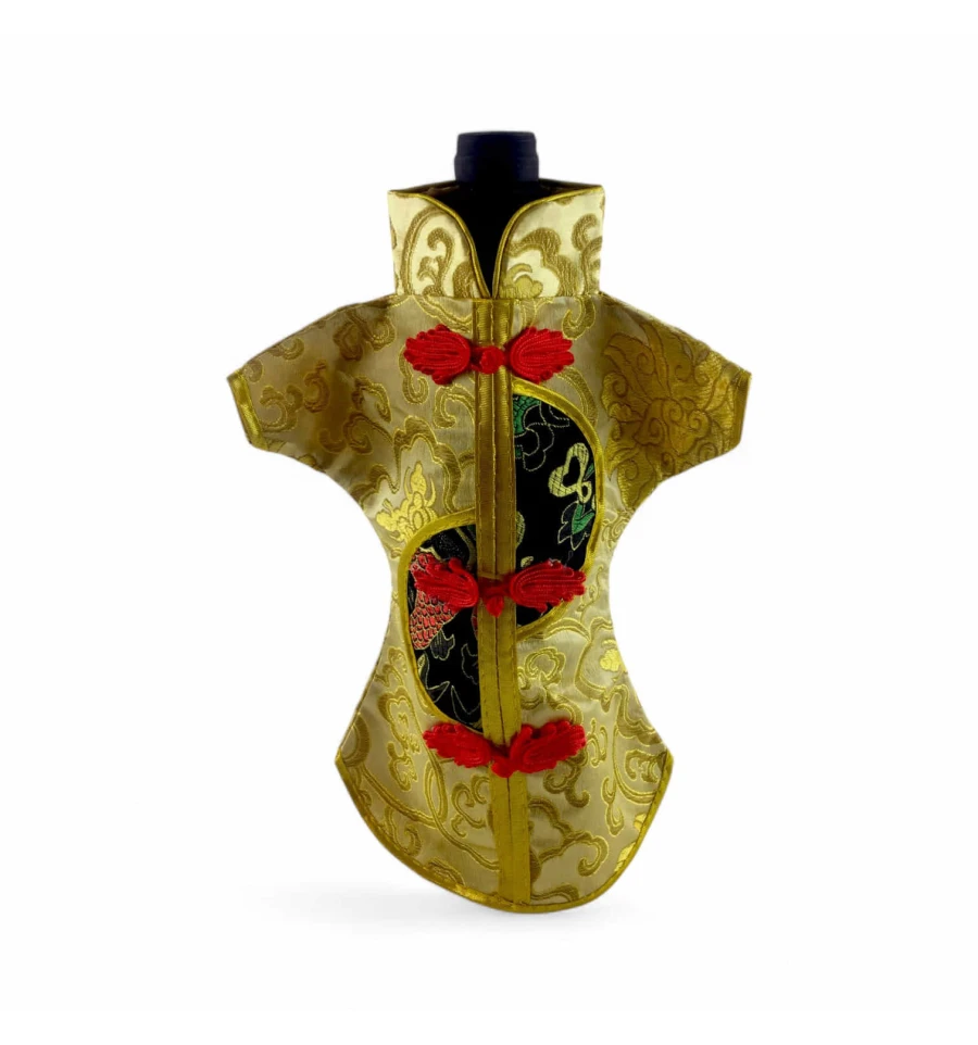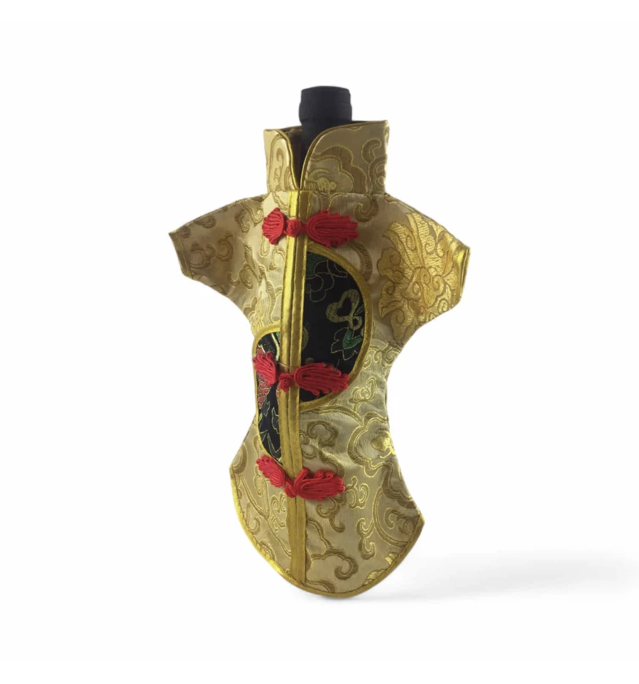 Цей елегантний чохол на пляшку виконаний у традиційному східному стилі та нагадує мініатюрне кімоно. Він виготовлений із міцної тканини з яскравим орнаментом, що включає символи та зображення, типові для східної культури.