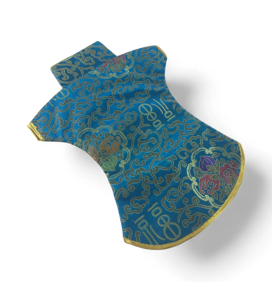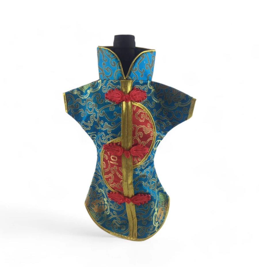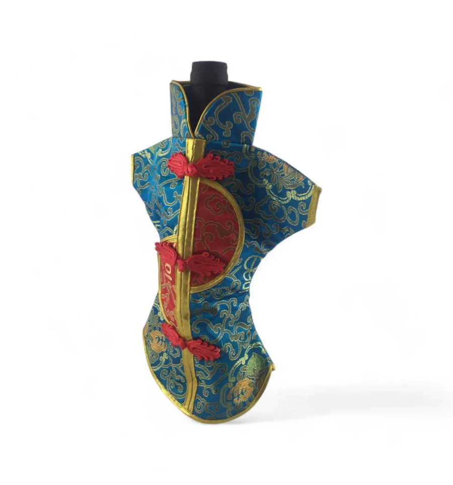 Цей елегантний чохол на пляшку виконаний у традиційному східному стилі та нагадує мініатюрне кімоно. Він виготовлений із міцної тканини з яскравим орнаментом, що включає символи та зображення, типові для східної культури.