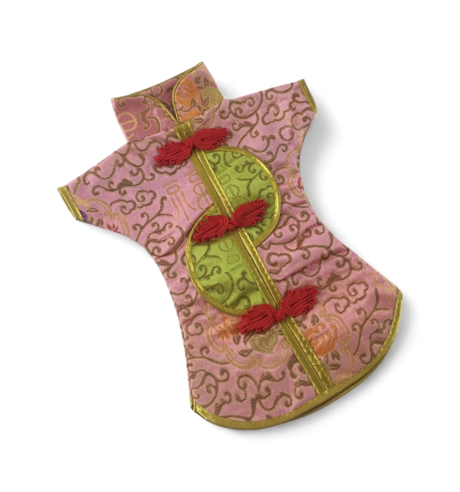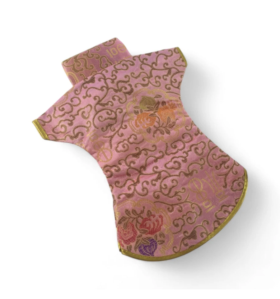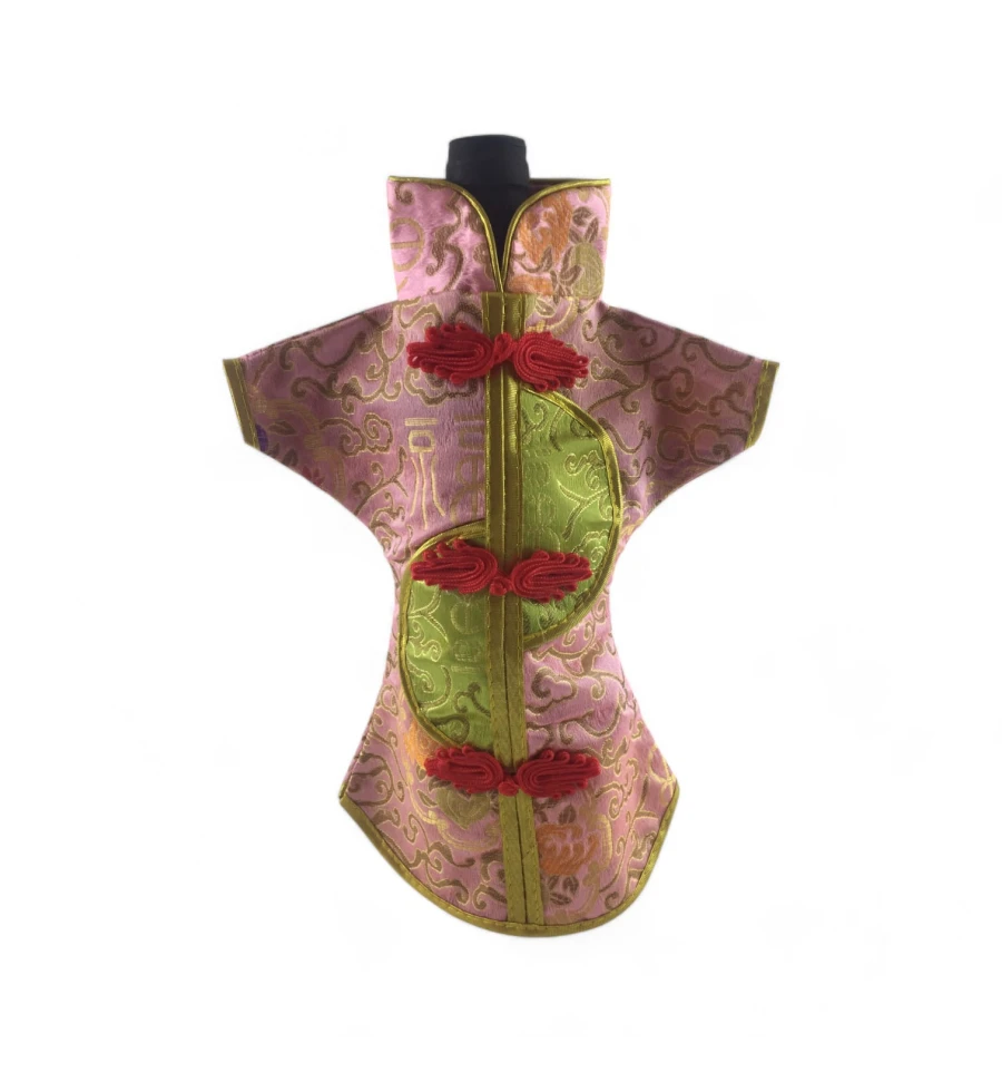 Цей елегантний чохол на пляшку виконаний у традиційному східному стилі та нагадує мініатюрне кімоно. Він виготовлений із міцної тканини з яскравим орнаментом, що включає символи та зображення, типові для східної культури.