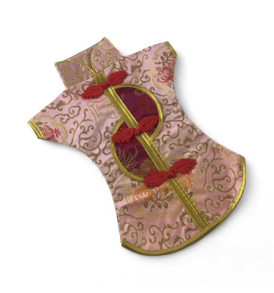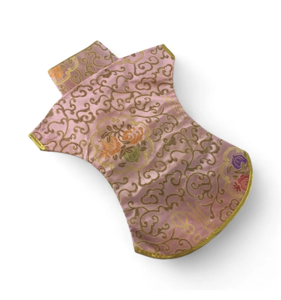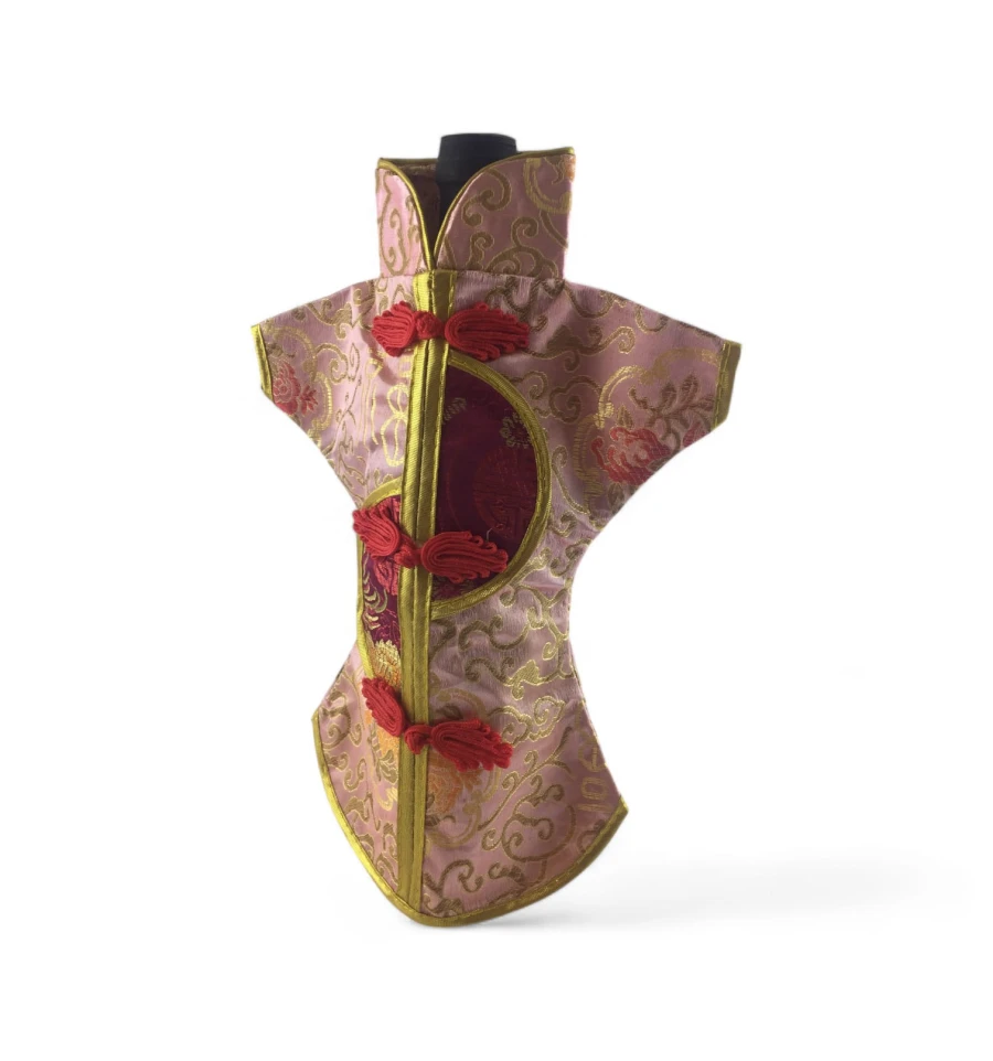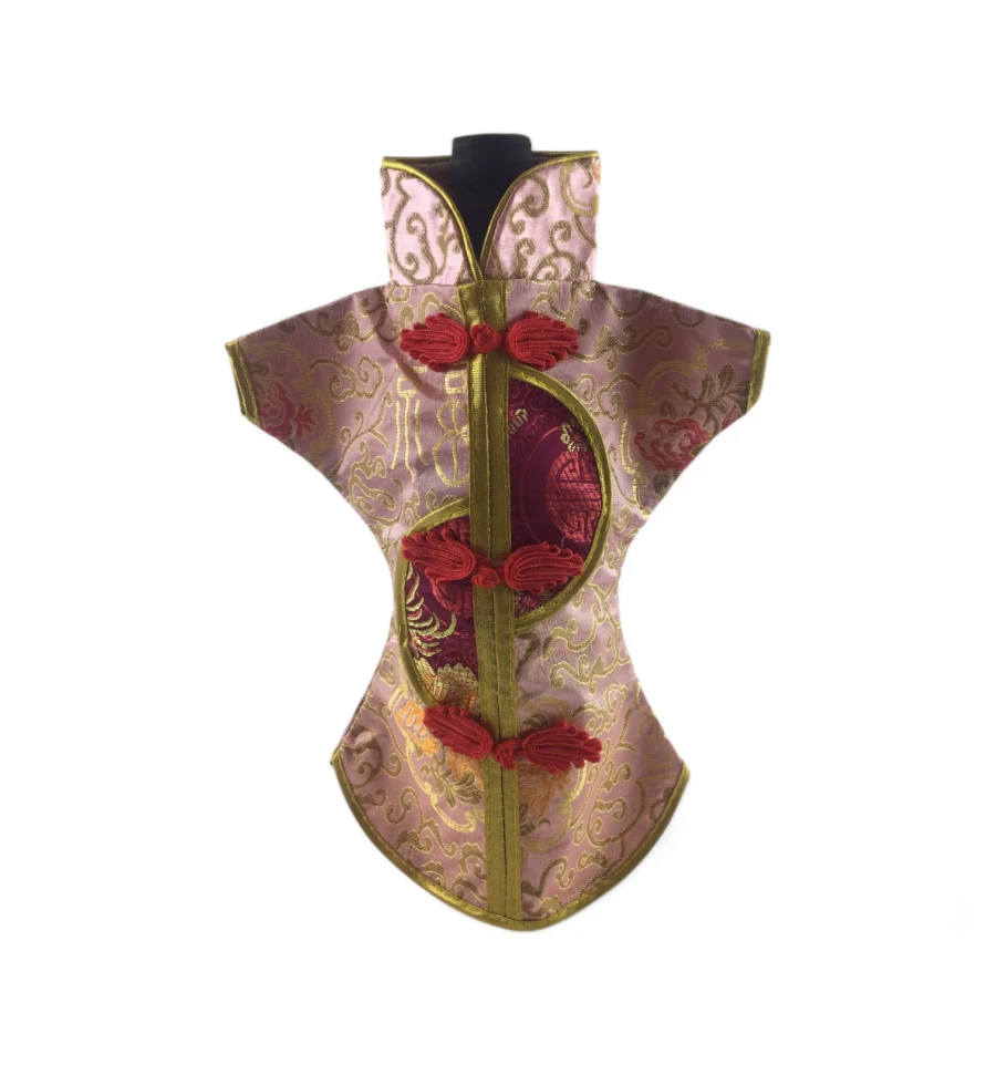 Цей елегантний чохол на пляшку виконаний у традиційному східному стилі та нагадує мініатюрне кімоно. Він виготовлений із міцної тканини з яскравим орнаментом, що включає символи та зображення, типові для східної культури.