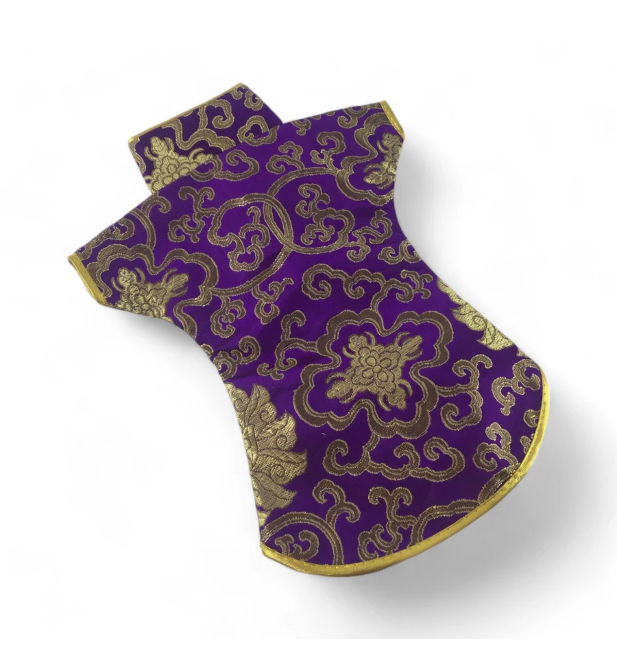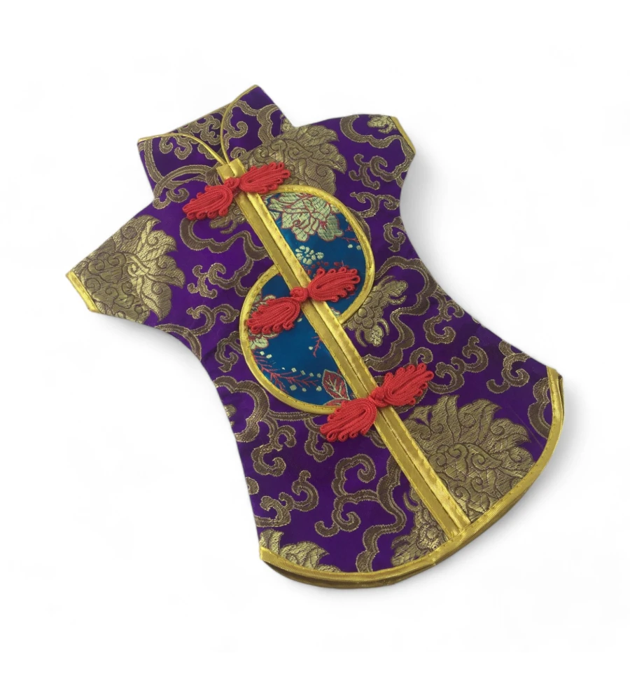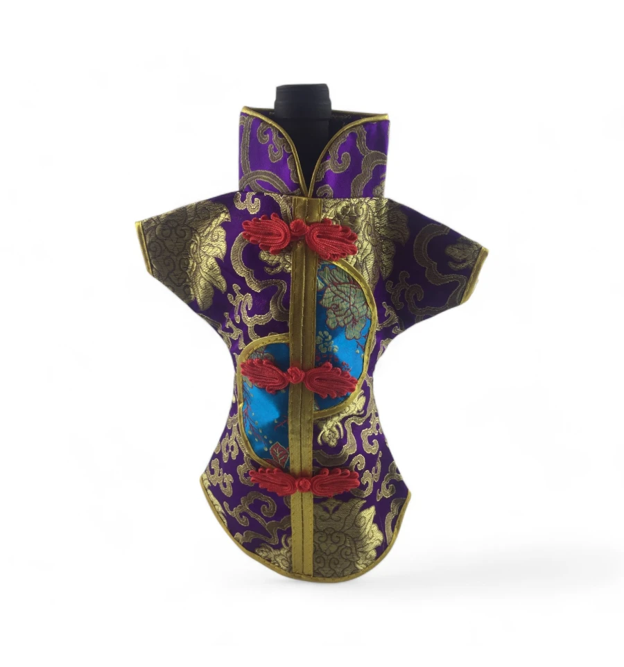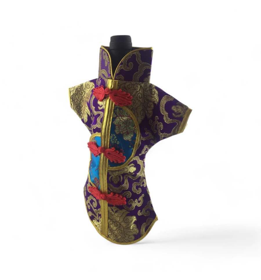 Цей елегантний чохол на пляшку виконаний у традиційному східному стилі та нагадує мініатюрне кімоно. Він виготовлений із міцної тканини з яскравим орнаментом, що включає символи та зображення, типові для східної культури.