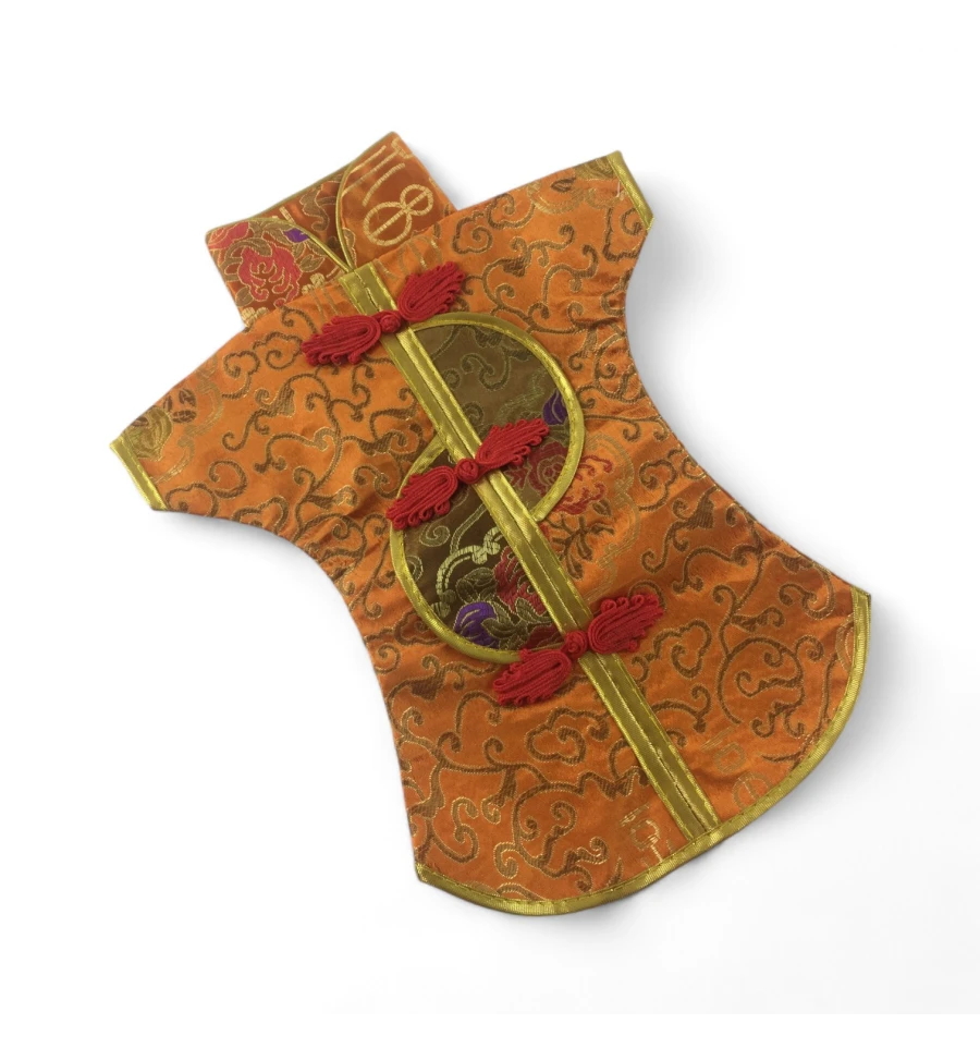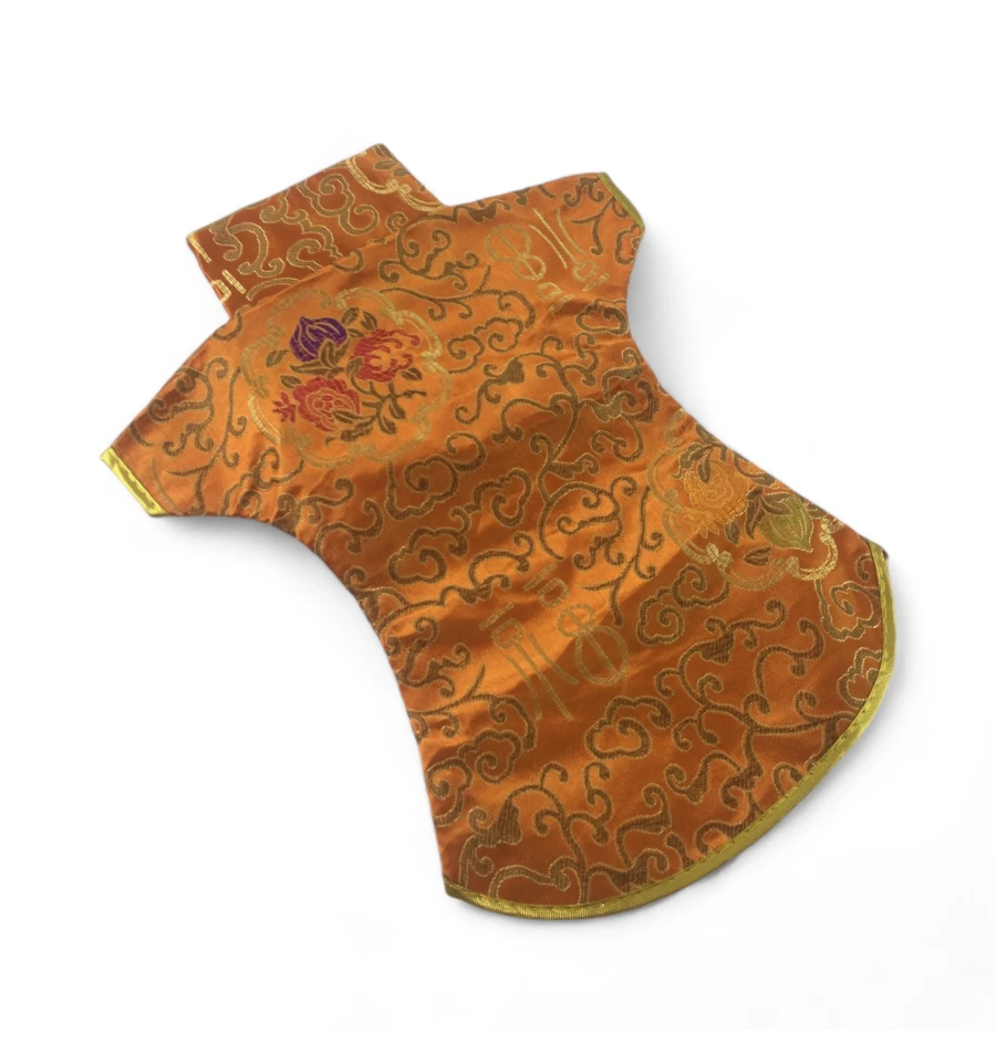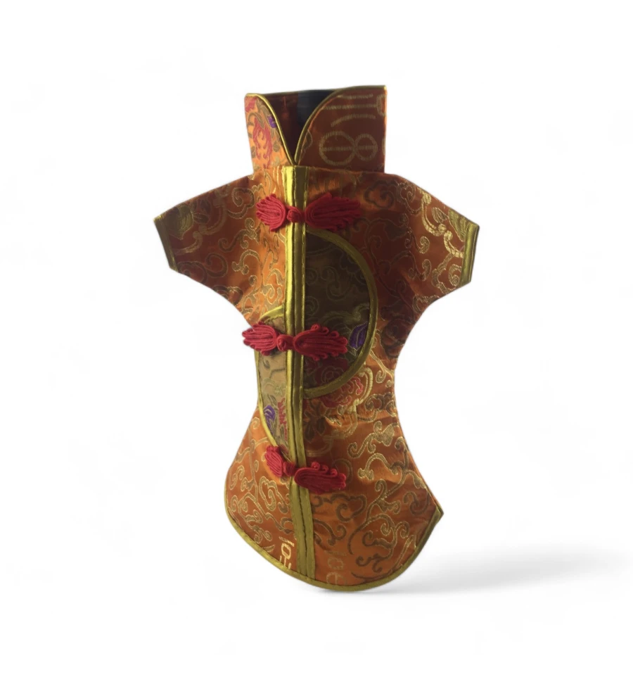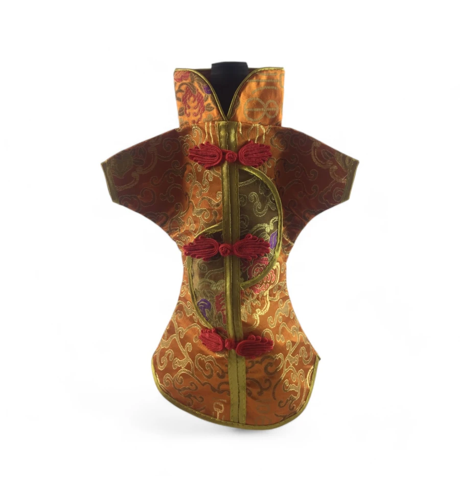 Цей елегантний чохол на пляшку виконаний у традиційному східному стилі та нагадує мініатюрне кімоно. Він виготовлений із міцної тканини з яскравим орнаментом, що включає символи та зображення, типові для східної культури.